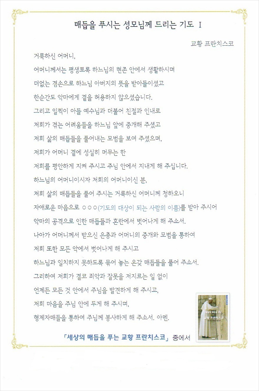 매듭을 푸시는 성모님께 드리는 기도 작성자♥보니파시아|작성시간14.09.08|조회수313 목록 댓글 0 글자크기 작게가 글자크기 크게가 다음검색 현재 게시글 추가 기능 열기 북마크 신고 센터로 신고 댓글 댓글 0 댓글쓰기 답글쓰기 댓글 리스트