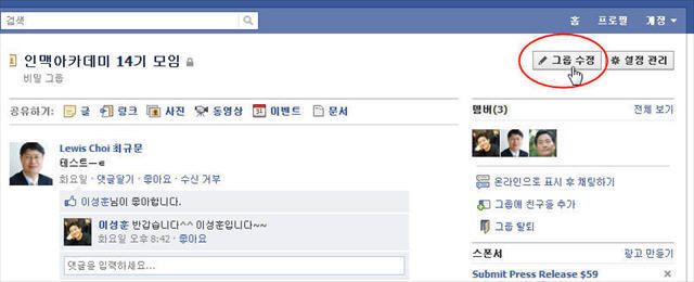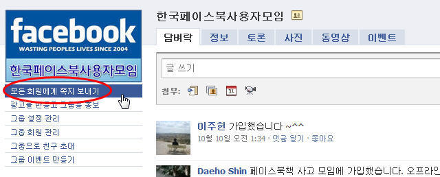 해당 [그룹 담벼락]으로 글이 올라가는 동시에 그룹 멤버 전원에게 페이스북 접속계정(이메일)으로 메시지가 전송됨)