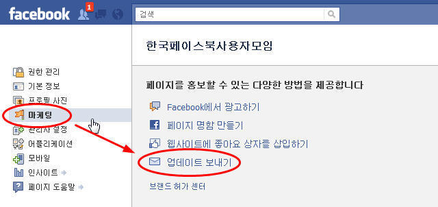 4-2. [페이지 편집]-[마케팅] 클릭 후 우측 메뉴에서 [업데이트 보내기] 클릭: