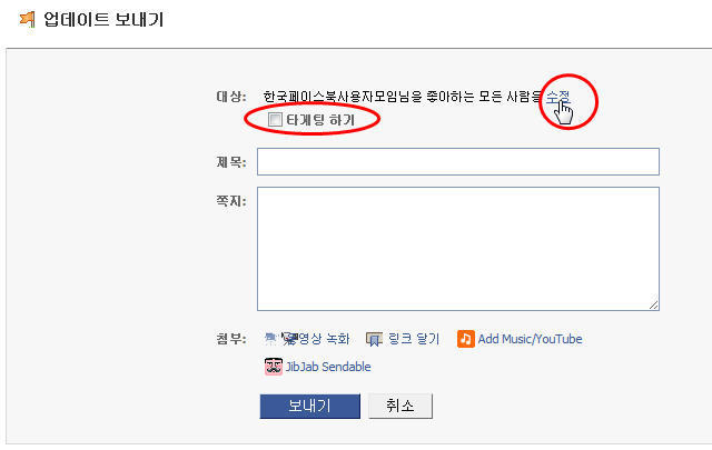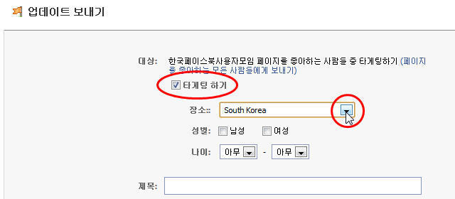 4-4. 만약 쪽지 보내는 대상을 특정 국가(특정 주)나 성별, 연령대를 선정하여 선택적으로 보내고 싶을 때는 [대상:] 항목 뒷쪽의 [수정] 링크, 또는 아래쪽 줄의 [타게팅 하기] 박스에 체크를 클릭: