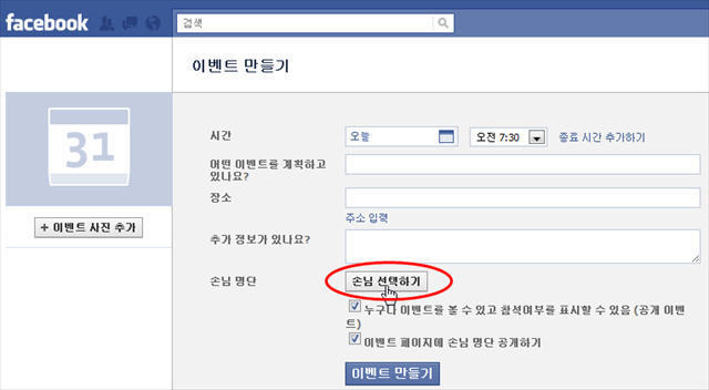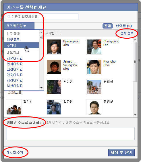 불러온 명단 전체를 모두 한꺼번에 선택하고 싶을 때는 오른쪽 상단의 [전체 선택] 링크를 클릭하면 됨. ** 만약 페이스북 가입자가 아닌 친구에게 이벤트 초대장을 함께 보내고 싶으면 [이메일 주소로 초대하기] 항목 란 안에 초대하고자 하는 분의 이메일 주소를 쉼표로 구분하여 추가하면 됨.