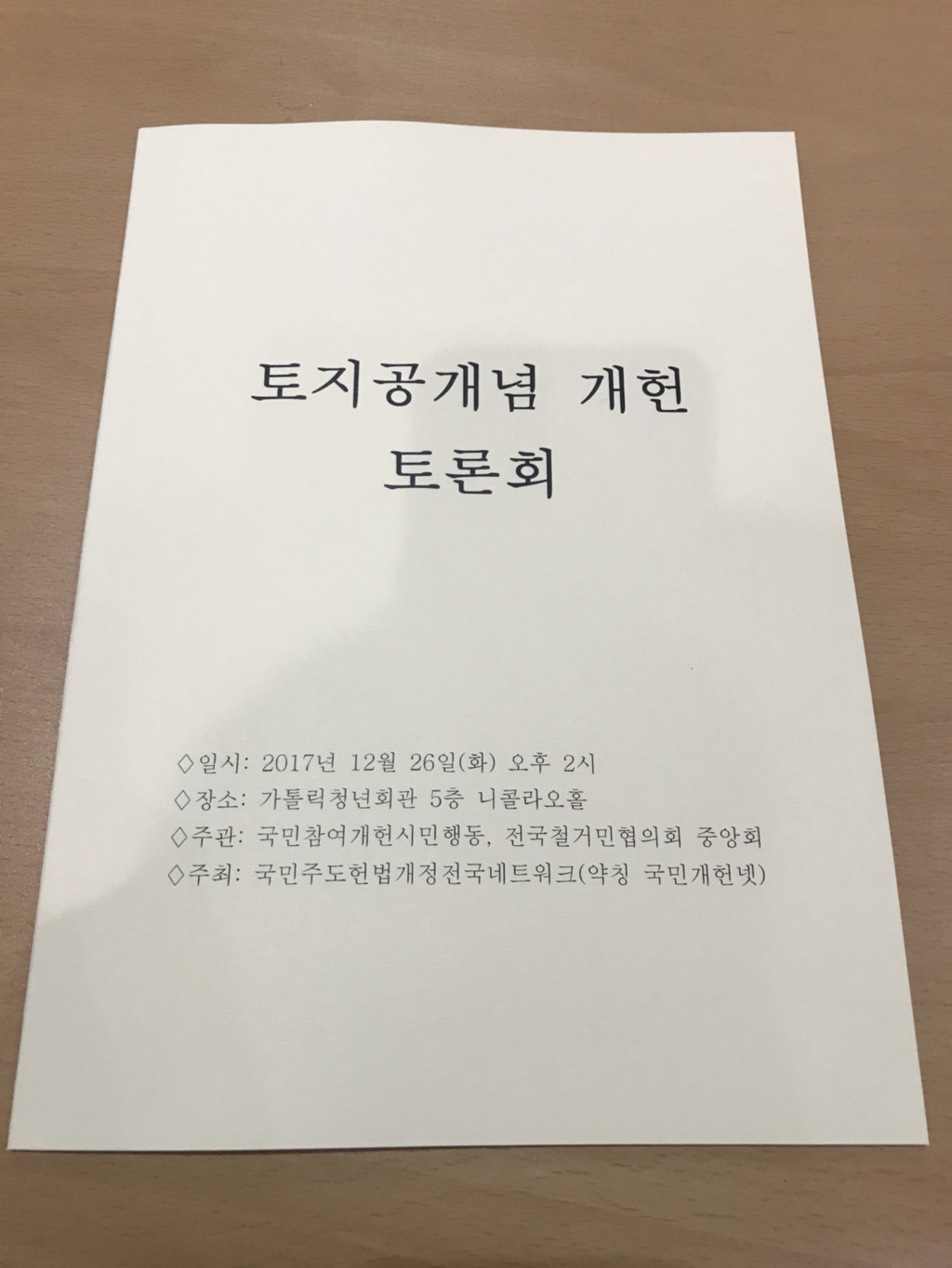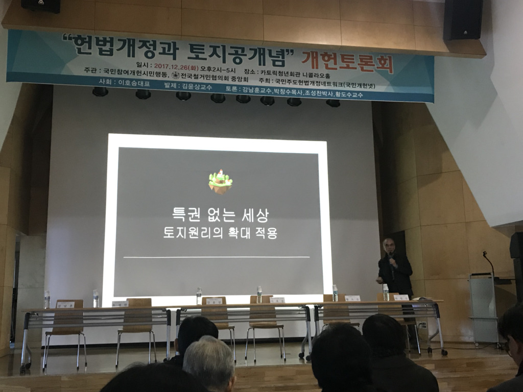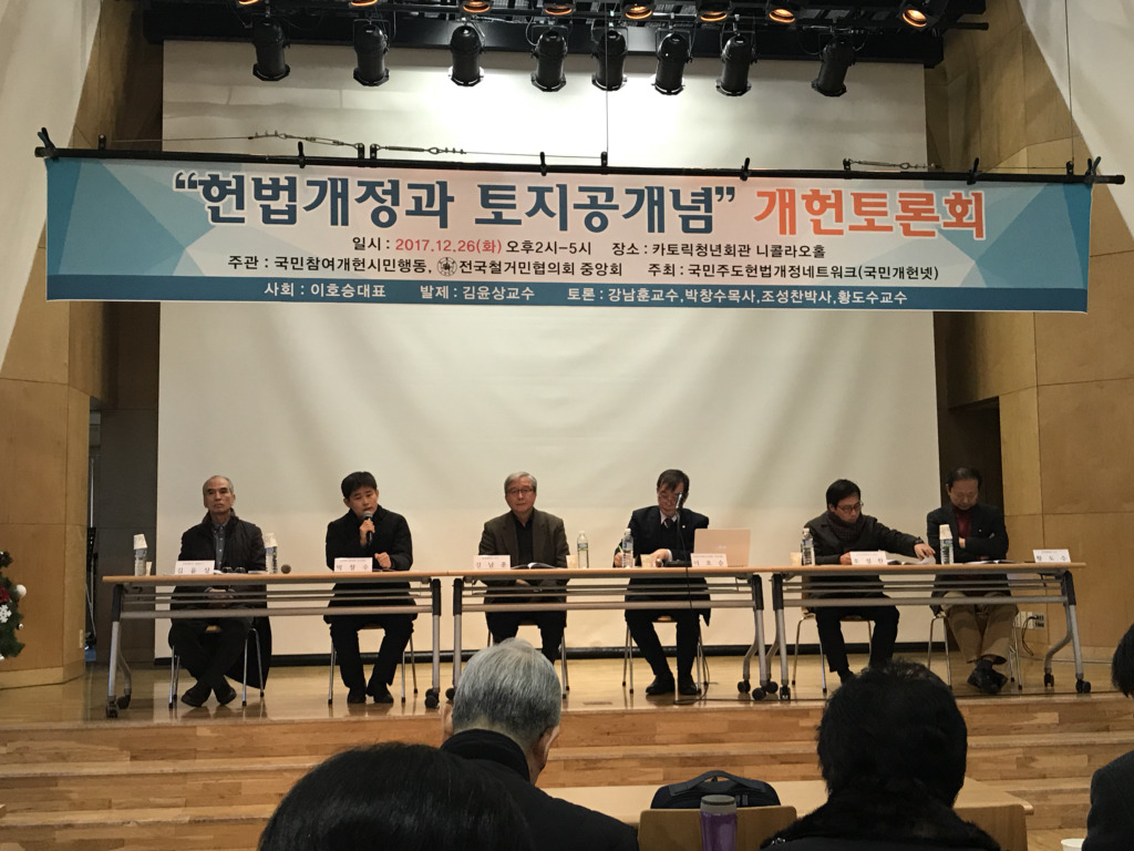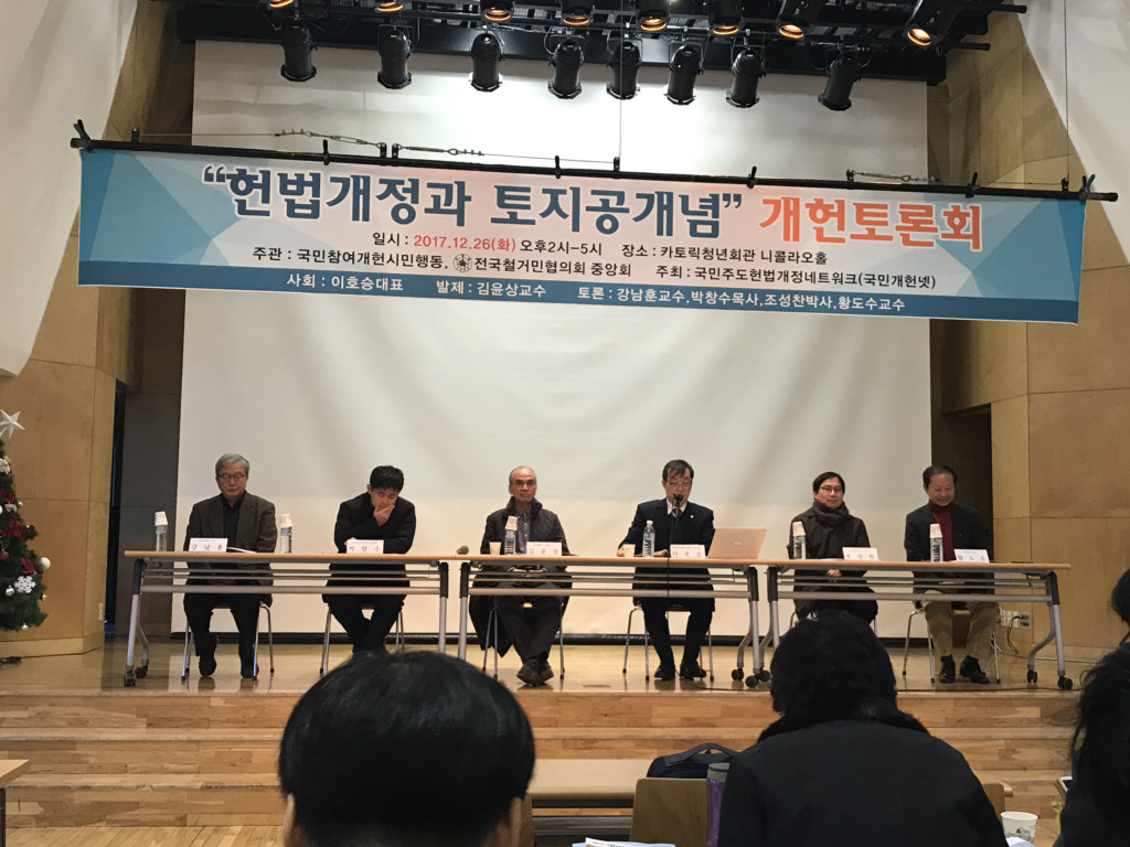 12월 26일 크리스마스 선물을 안고 국민주도 헌법개정 전국 네트워크(준)에서 주최하고 국민참여개헌시민행동, 전국철거민협의회 중앙회에서 주관한 "헌법개정과 토지공개념" 개헌 토론회가 카톨릭청년회관 니콜라오홀에서 열렸다.