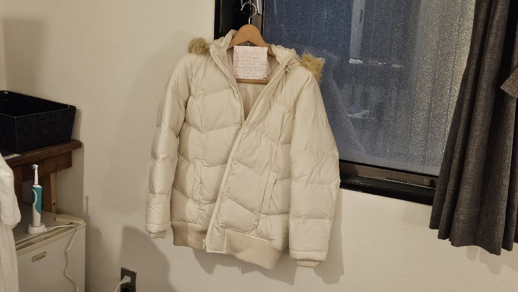 after washing and thinking about it, i'm saying goodbye and thank you to this beige puffer, i'm so glad I found you thrifting and it's a little easy to let you go because you aren't expensive. I would have taken you home if you weren't so bulky. I hope someone would make good use of you and would appreciate wearing you the way I did. Thank you for keeping me warm and dry thru the rain, wind and snow. Be happy with a new owner okay? I left a note on it too