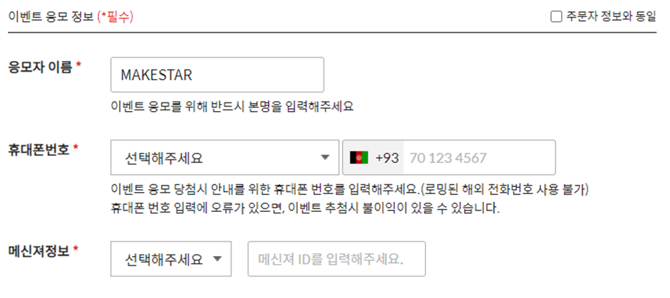 4. 응모자 정보 입력 시 주문 건 1개당 1명의 정보만 입력 부탁드립니다. 2명 이상 정보 입력 시 임의로 1명의 정보만 선택, 인정합니다. 해당 내용을 숙지하지 않음으로 인하여 발생하는 문제에 대하여 진행사는 책임지지 않습니다.