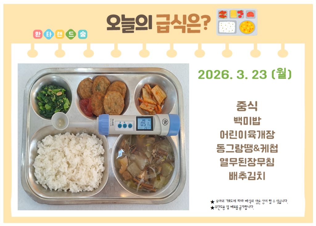 3월 23일 (월) 식단 사진 작성자환타랜드 영양사|작성시간26.03.24|조회수23 목록 댓글 0 글자크기 작게가 글자크기 크게가 다음검색 현재 게시글 추가 기능 열기 북마크 공유하기 신고 센터로 신고 댓글 댓글 0 댓글쓰기 답글쓰기 댓글 리스트