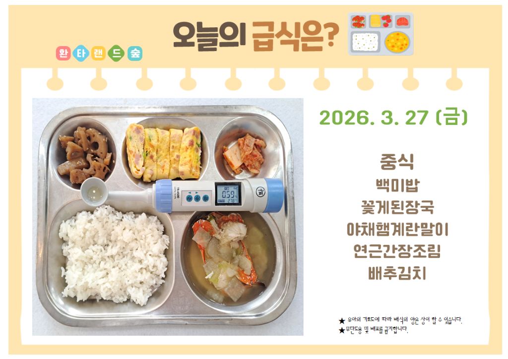 3월 27일 (금) 식단 사진 작성자환타랜드 영양사|작성시간26.03.27|조회수28 목록 댓글 0 글자크기 작게가 글자크기 크게가 다음검색 현재 게시글 추가 기능 열기 북마크 공유하기 신고 센터로 신고 댓글 댓글 0 댓글쓰기 답글쓰기 댓글 리스트