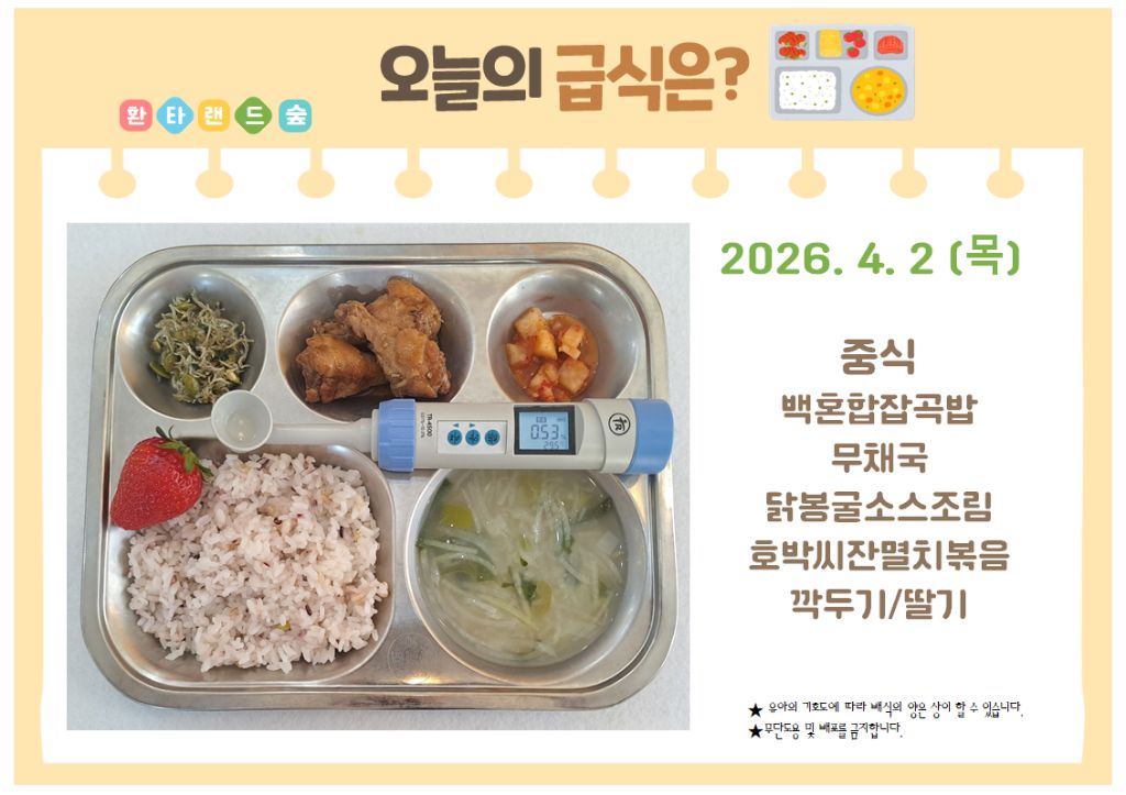4월 2일 (목) 식단 사진 작성자환타랜드 영양사|작성시간26.04.02|조회수16 목록 댓글 0 글자크기 작게가 글자크기 크게가 다음검색 현재 게시글 추가 기능 열기 북마크 공유하기 신고 센터로 신고 댓글 댓글 0 댓글쓰기 답글쓰기 댓글 리스트