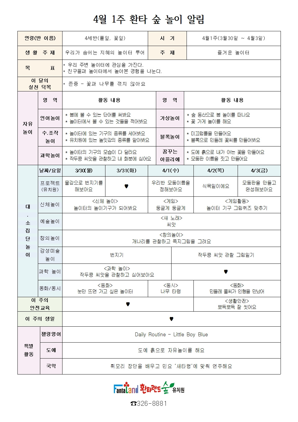 ♥ 만 4세 4월 1주 주간 놀이 계획안 입니다 ♥ 작성자김지우선생님₍⑅ᐢ. ̬.ᐢ₎|작성시간26.03.27|조회수26 목록 댓글 0 글자크기 작게가 글자크기 크게가 다음검색 현재 게시글 추가 기능 열기 북마크 공유하기 신고 센터로 신고 댓글 댓글 0 댓글쓰기 답글쓰기 댓글 리스트