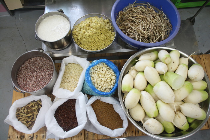 무 70%, 그외 찹쌀,생강,도라지,수수,마늘,감초,백개자,묏대추열매,엿기름등 총 12가지 재료가 들어갑니다.