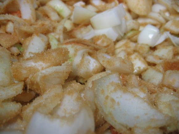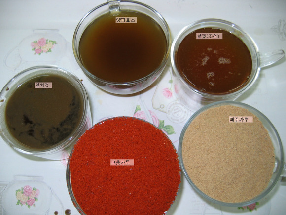 2012년 3월 - 완성된 재료들을 모아봤습니다. 멸치젓, 양파효소, 메주가루, 고춧가루, 쌀엿입니다.