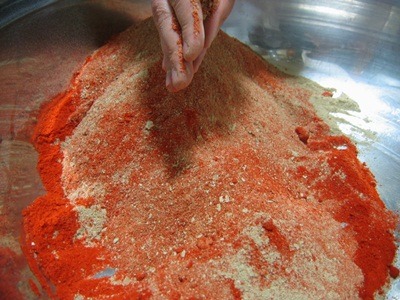 고추장 만드는 과정은 이전과 똑같습니다. 채친 고춧가루와 메주가루를 혼합