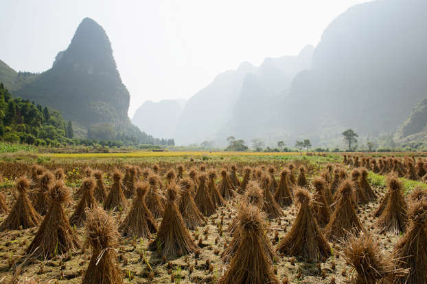 양수오라는 이 작은 마을은 광시좡족 자치구의 웅장한 카르스트 봉우리에 에워싸여 있습니다.