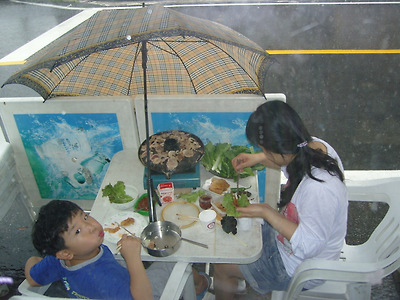 가계앞에서 고기를 굽는데 비가 온다.