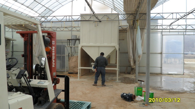 도정시 발생하는 먼지가 육묘장하우스안을 뽀얗게 만들어 깨끗이 청소해 놓은 하우스안과 하우스안에 있는