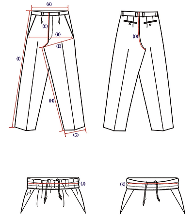 (I) 바지 길이 (outside leg seam) : 바지 길이는 별도의 지시가 없는한 벨트를 포함해서 바지 밑단까지 길이를 잰다.