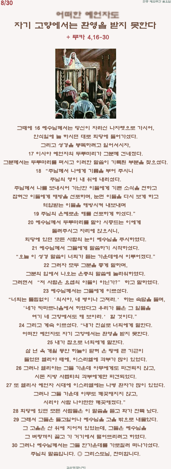 이 말씀은 예수 그리스도께서 이 세상에 왜 오셨는지, 또 무엇을 위해서 이 세상에 살아야 하는지를 알려주는 예수님의 생애의 핵심을 드러내는 말씀이다. 예수님은 이 성서 말씀을 읽고 나서 “오늘 이 성경 말씀이 너희가 듣는 가운데에서 이루어졌다.”(21절) 하셨다. 그 순간 그분의 가르침이 시작되었다. 그분은 가난한 이들에게 복음을 전하기 시작하셨고 그들을 가장 먼저 축복하셨다. 그러나 나자렛 사람들은 예수님을 믿지 않는다. 저 사람은 요셉의 아들이 아닌가?“(22절) 하면서 배우지도 못한 사람이 글을 읽는 것을 보고 신기해하지만, 은총의 말씀에 놀라면서도 그 말씀을 하찮게 여겼다. 그래서 예수께서는 왜 고향에서 기적을 행하지 않으시는지 엘리야가 사렙타 마을의 과부에게만 갔고, 엘리사가 시리아 사람 나아만만 고쳐준 이야기를 들어 설명하셨다. 주님의 이 말씀은 완고한 이스라엘 대신 장차 당신을 맞아들여 치유 받을 다른 민족들을 가리킨다.