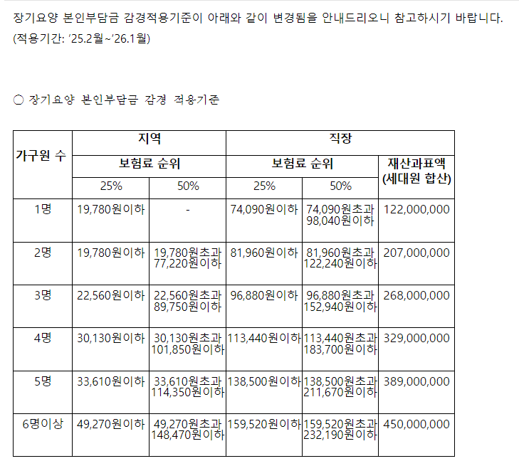 2025년 2월부터 2026년 1월까지 적용되는 장기요양 본인부담금 감경 기준이 변경되었습니다. 이에 따라 장기요양 서비스를 이용하시는 분들과 가족분들께서 참고하실 수 있도록 변경된 기준을 안내해 드립니다.