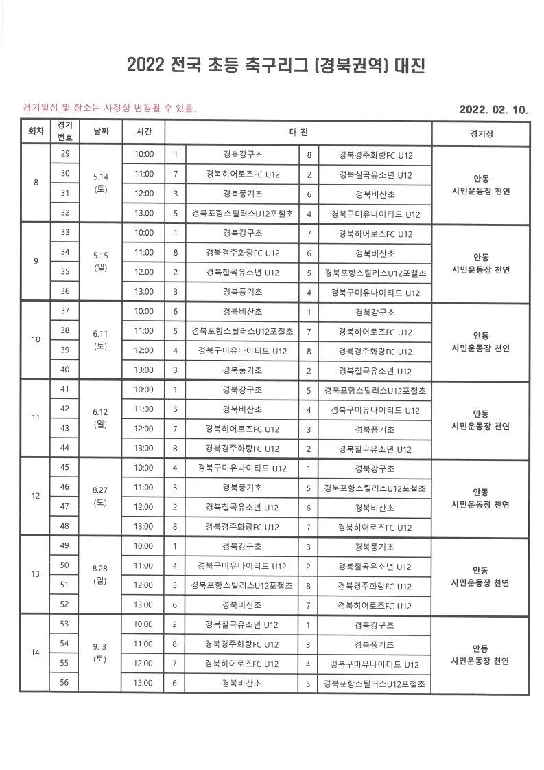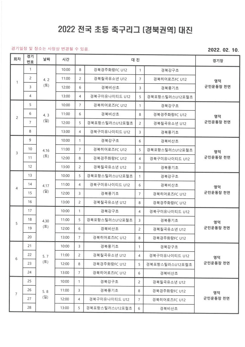 [스크랩] 2022 전국초등축구리그 경북권역리그 대진표(4월2일~9월3일) 작성자한국축구신문|작성시간22.03.01|조회수165 목록 댓글 0 글자크기 작게가 글자크기 크게가 초등.pdf1.74MB 첨부파일첨부된 파일이 3개 있습니다. jpg 파일 초등_2.jpg 다운로드 jpg 파일 초등_3.jpg 다운로드 pdf 파일 초등.pdf 다운로드 다음검색 스크랩 원문 : 풋볼뉴스(Football News) 현재 게시글 추가 기능 열기 북마크 공유하기 신고 센터로 신고 댓글 댓글 0 댓글쓰기 답글쓰기 댓글 리스트