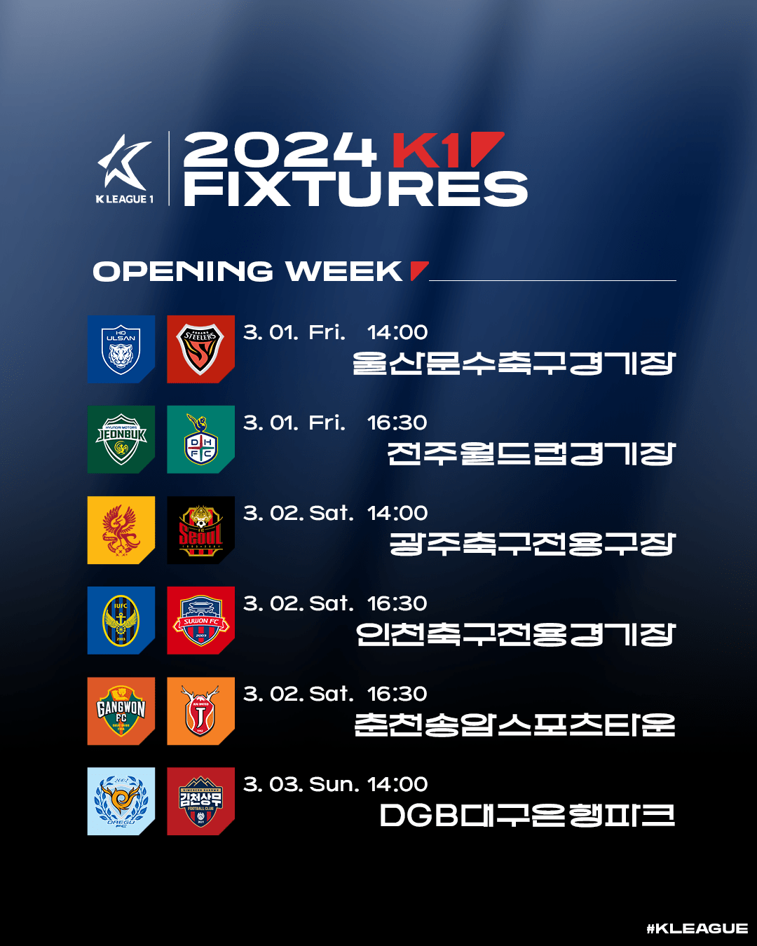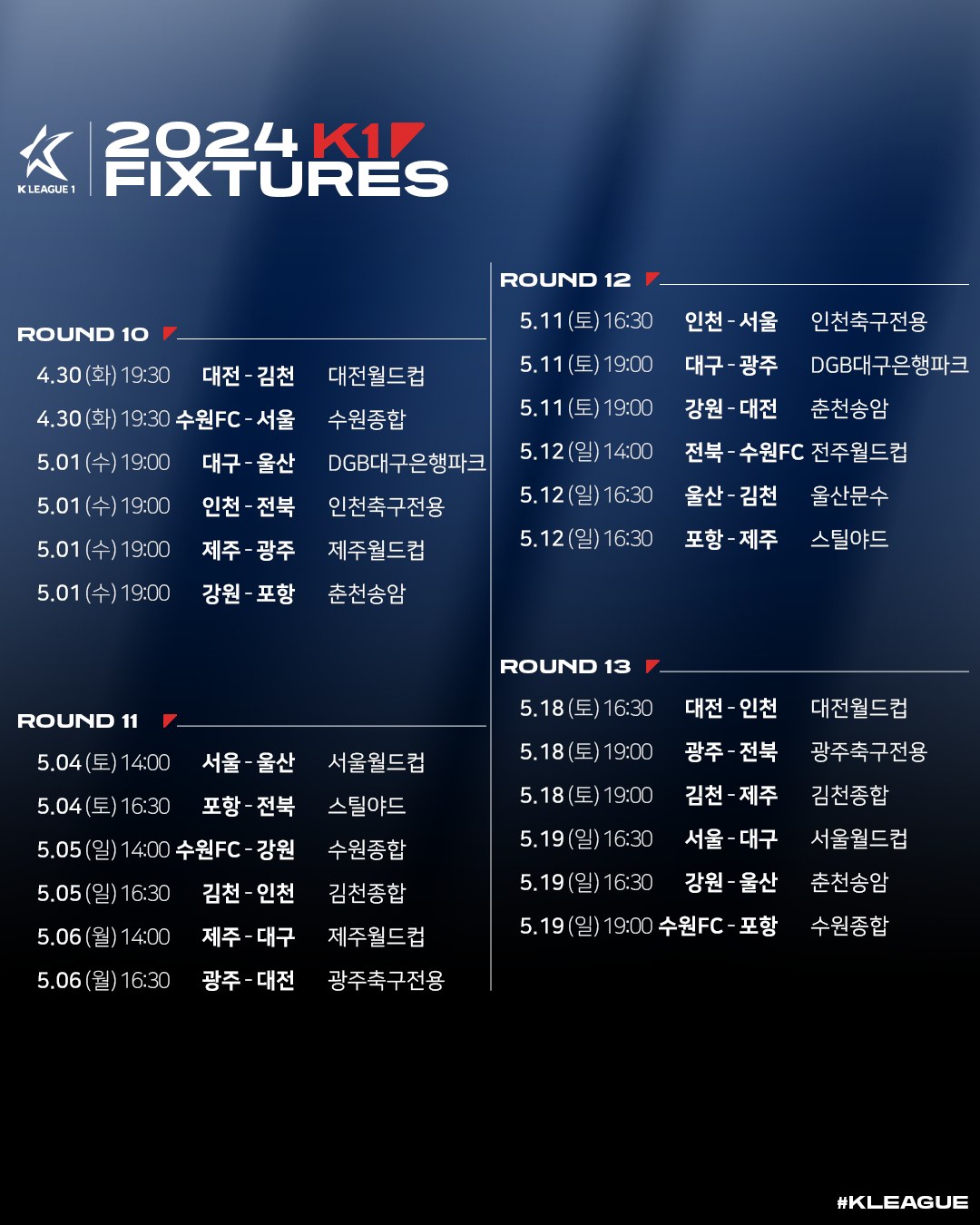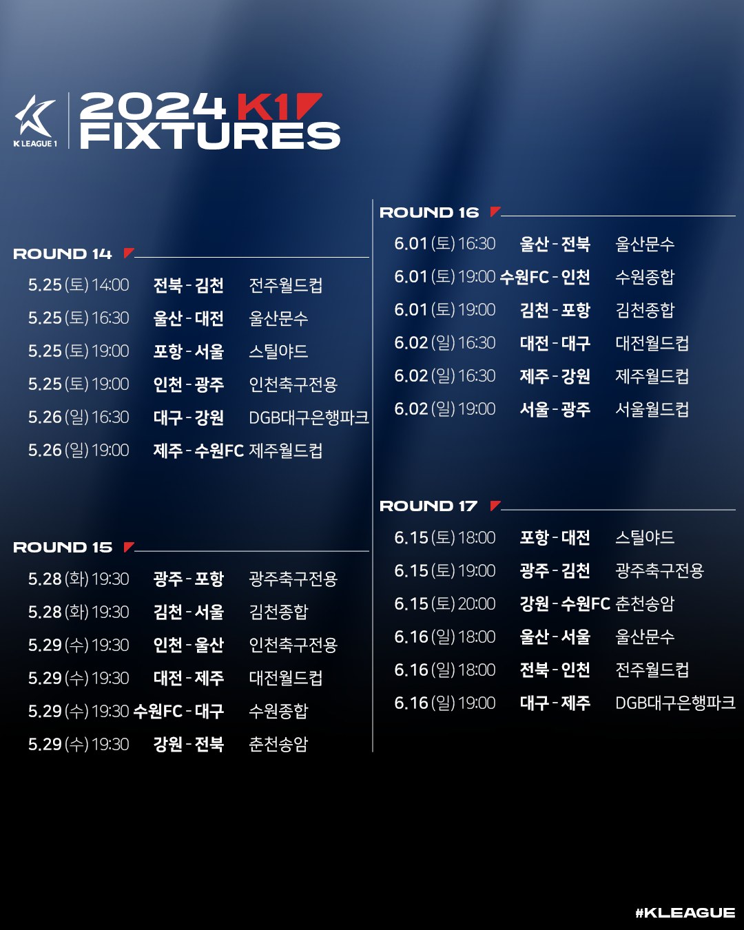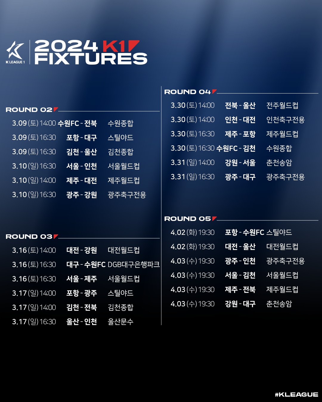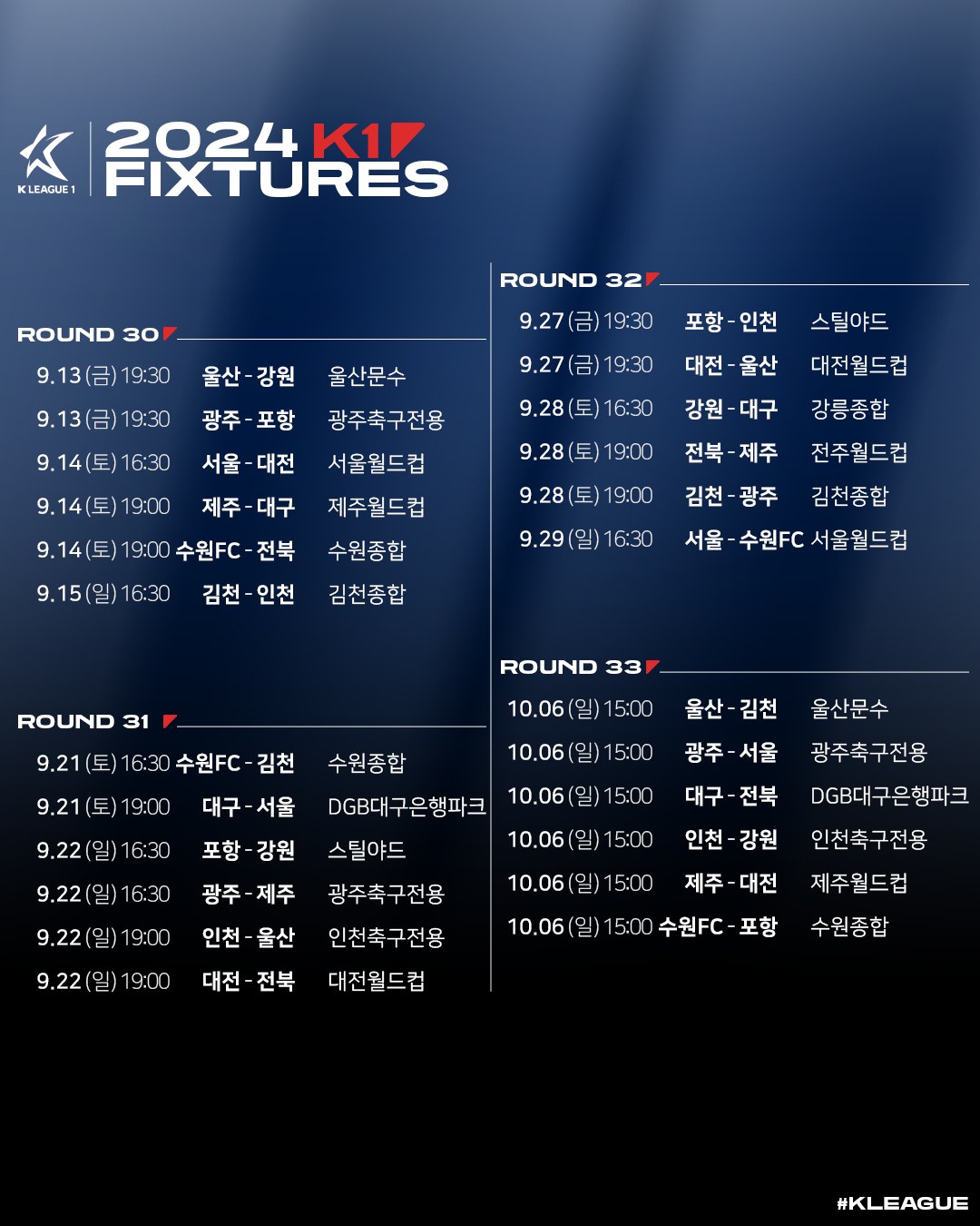 [스크랩] 2024시즌 K리그1 정규라운드(1R~33R) 경기일정(3월1일~10월6일) 작성자한국축구신문|작성시간24.01.16|조회수427 목록 댓글 0 글자크기 작게가 글자크기 크게가 다음검색 스크랩 원문 : 풋볼뉴스(Football News) 현재 게시글 추가 기능 열기 북마크 공유하기 신고 센터로 신고 댓글 댓글 0 댓글쓰기 답글쓰기 댓글 리스트