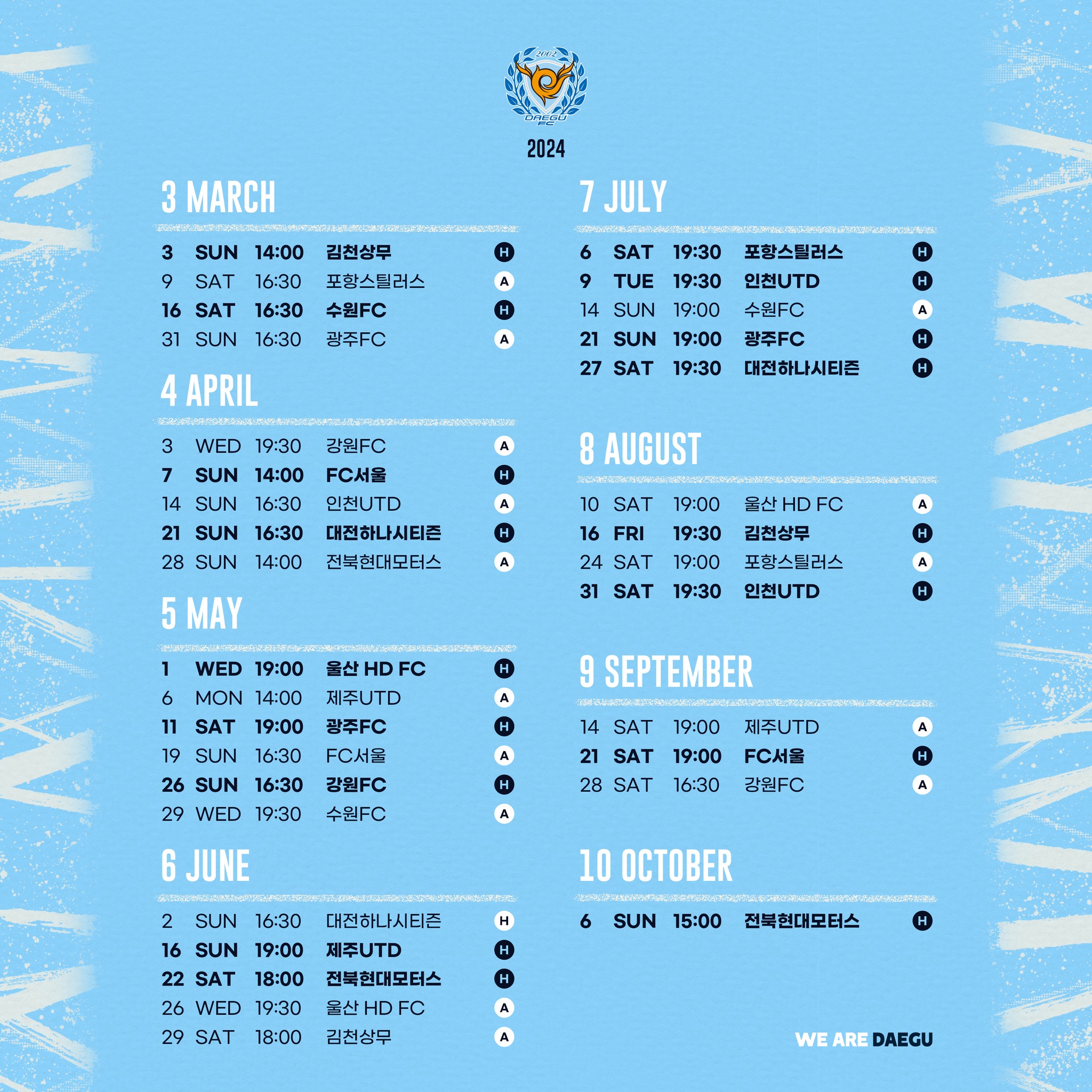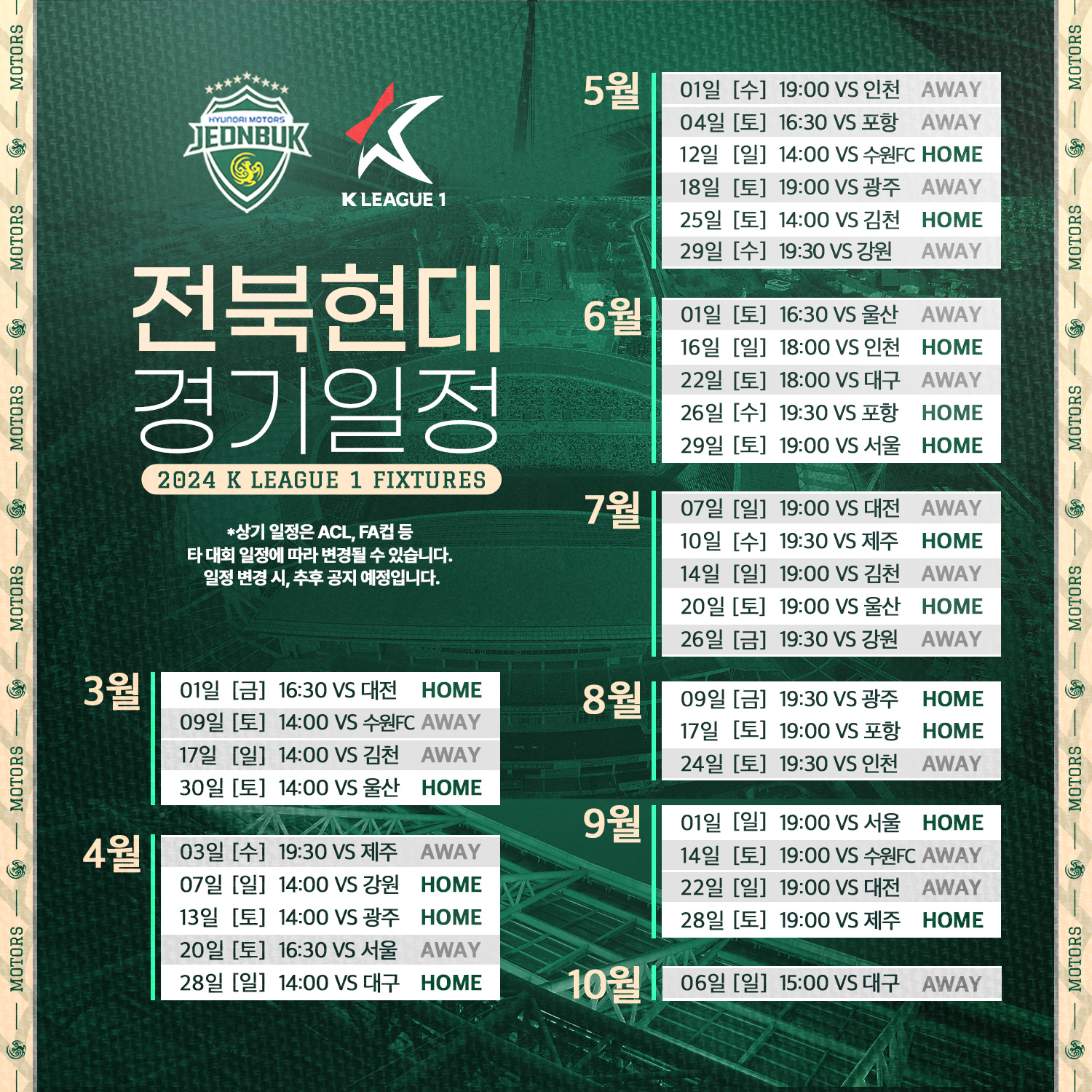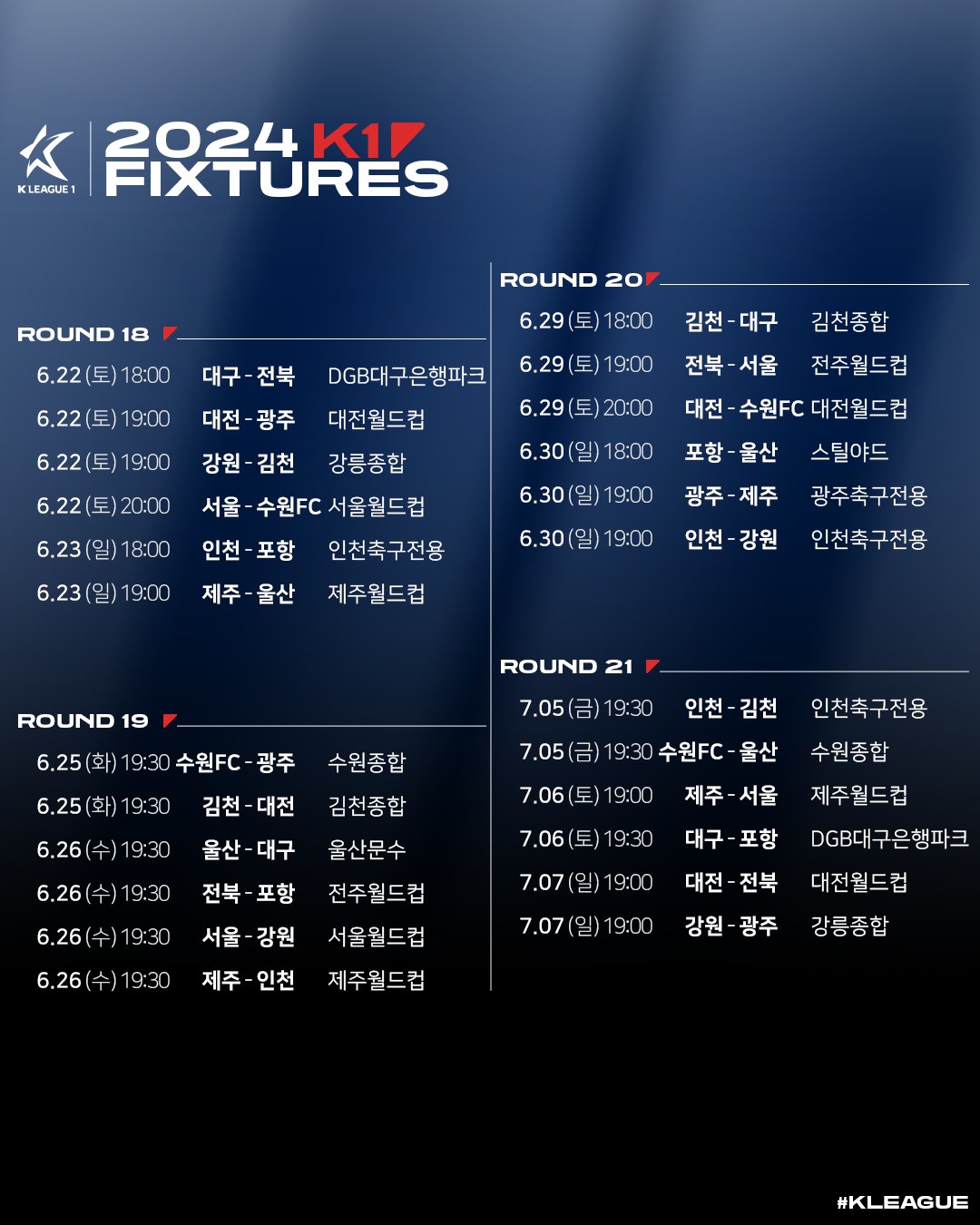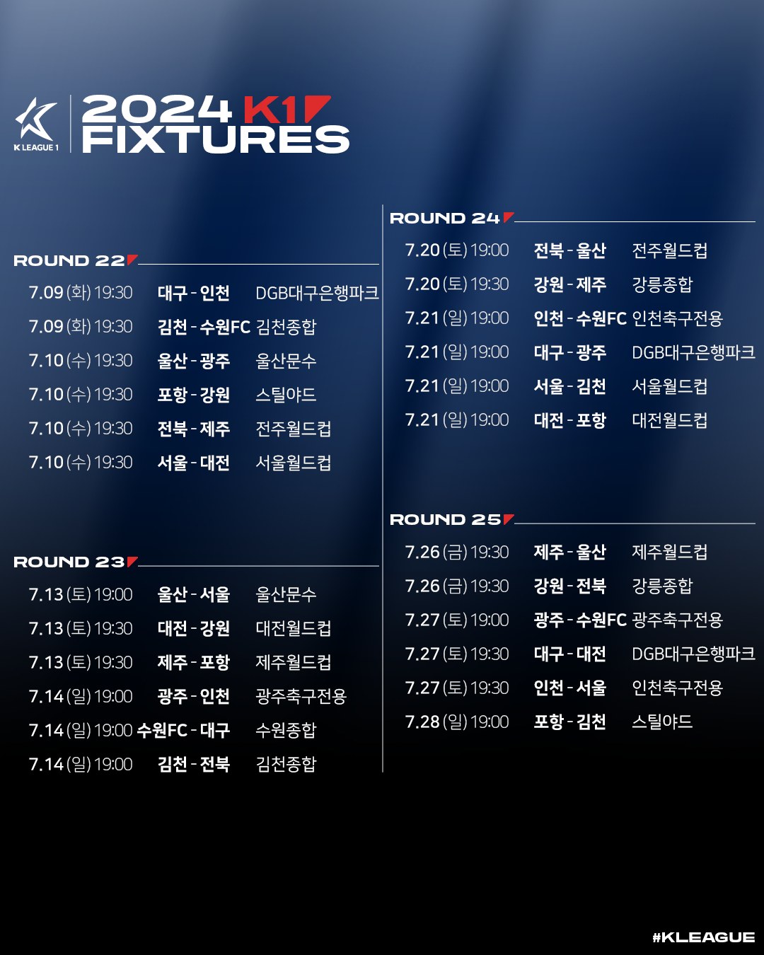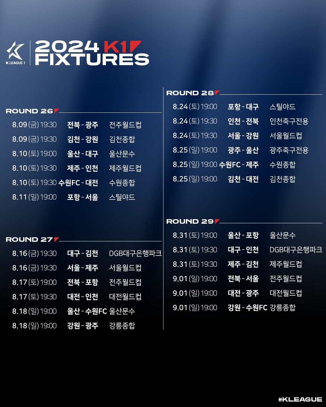 [스크랩] 2024시즌 K리그1 정규라운드(1R~33R) 경기일정(3월1일~10월6일) 작성자한국축구신문|작성시간24.01.16|조회수427 목록 댓글 0 글자크기 작게가 글자크기 크게가 다음검색 스크랩 원문 : 풋볼뉴스(Football News) 현재 게시글 추가 기능 열기 북마크 공유하기 신고 센터로 신고 댓글 댓글 0 댓글쓰기 답글쓰기 댓글 리스트