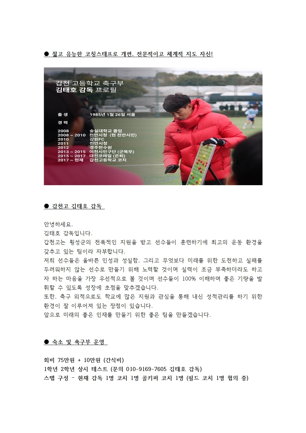 실력이 조금 부족하더라도 꿈을 갖고 성실하게 열심히 해보고 싶은 선수들의 연락을 기다립니다.