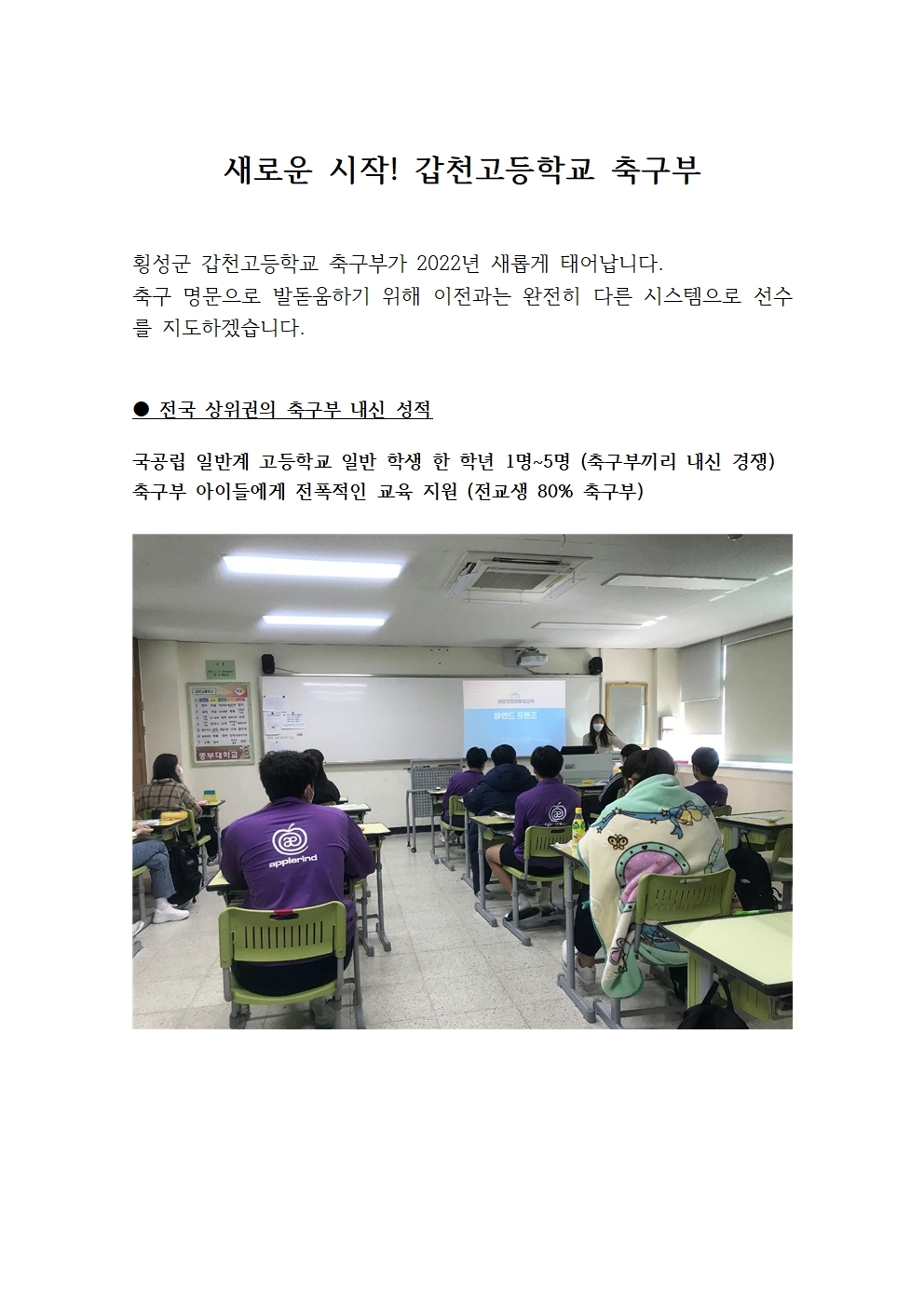작성자한국축구신문작성시간22.02.22조회수9,439 목록 댓글 1미래를 위한 도전, 갑천고 축구부의 새 출발