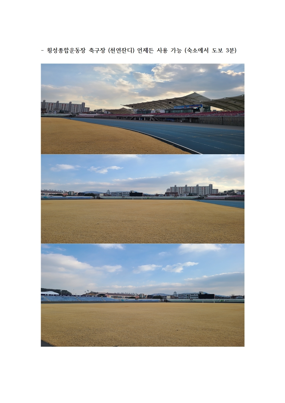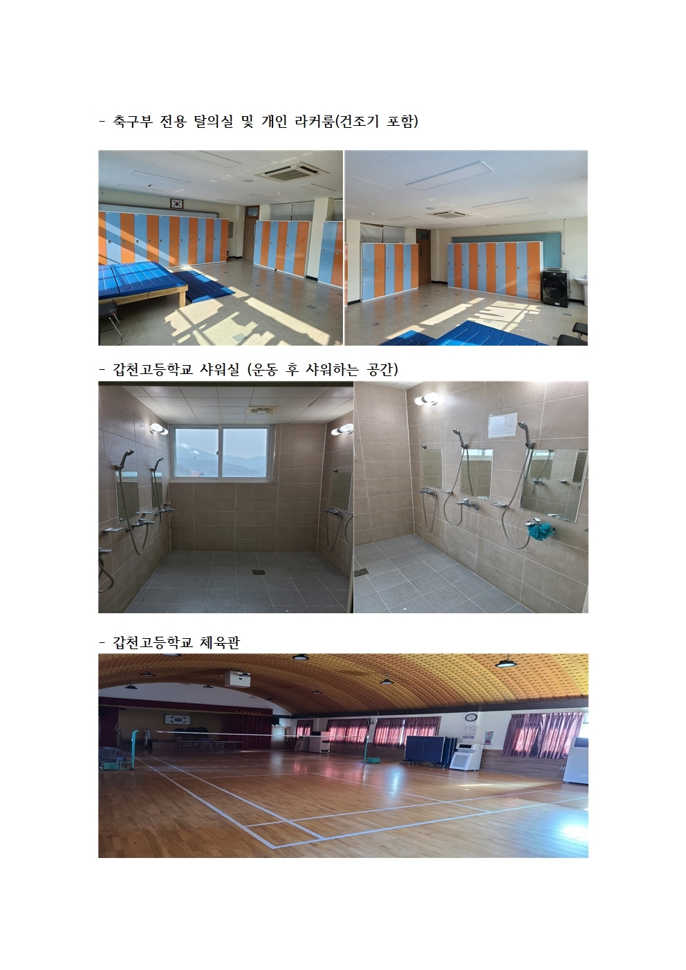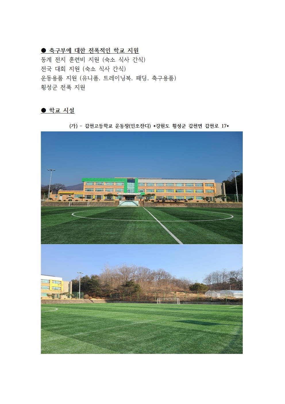 학교운동장과 횡성 생활 체육공원 및 종합운동장 사용과 각종 웨이트시설 등 실내 부대시설을 자유롭게 사용할 수 있는 최적의 여건 속 갑천고 축구부 선수들은 운동에만 전념할 수 있게 되어있다.