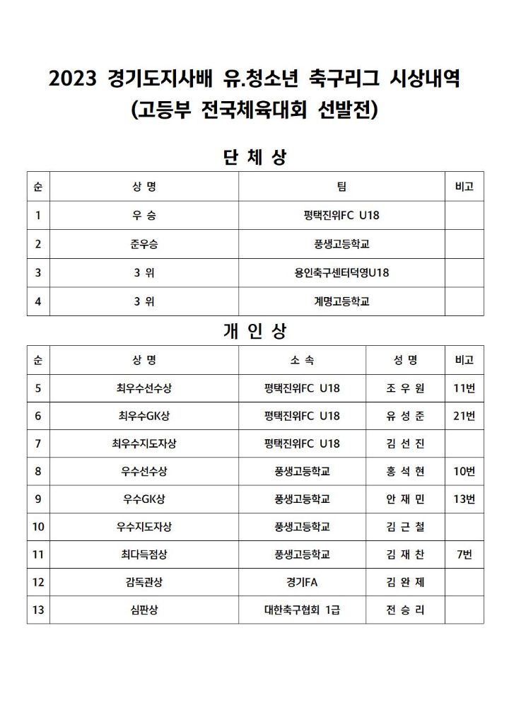 2023 경기도지사배 유ㆍ청소년축구대회겸 전국체전 선발전 결승전 경기결과