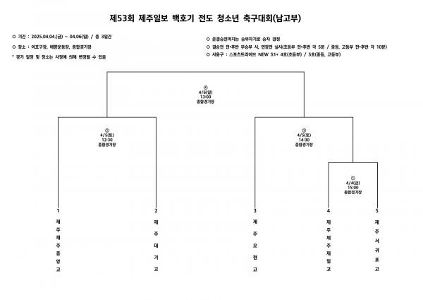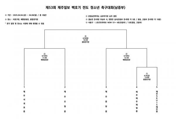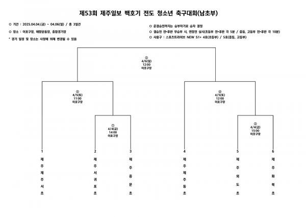 [백호기] 디펜딩 챔피언 제주제일고/제주중/제주서초 참가, 백호기 초·중·고등부 전도 청소년 축구대회 대진표(4/4~6)