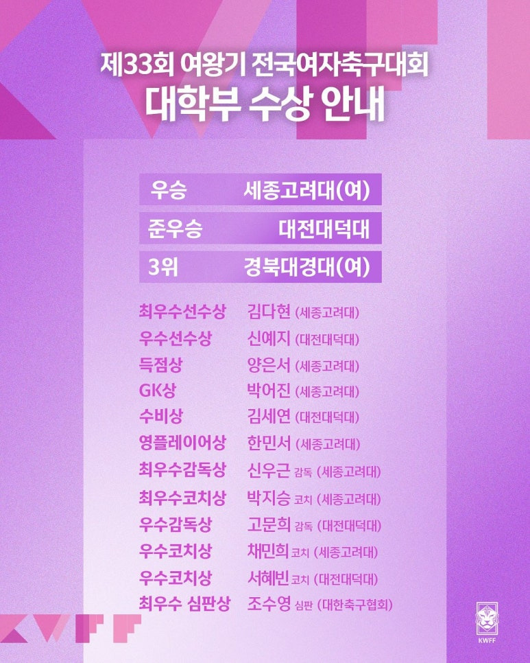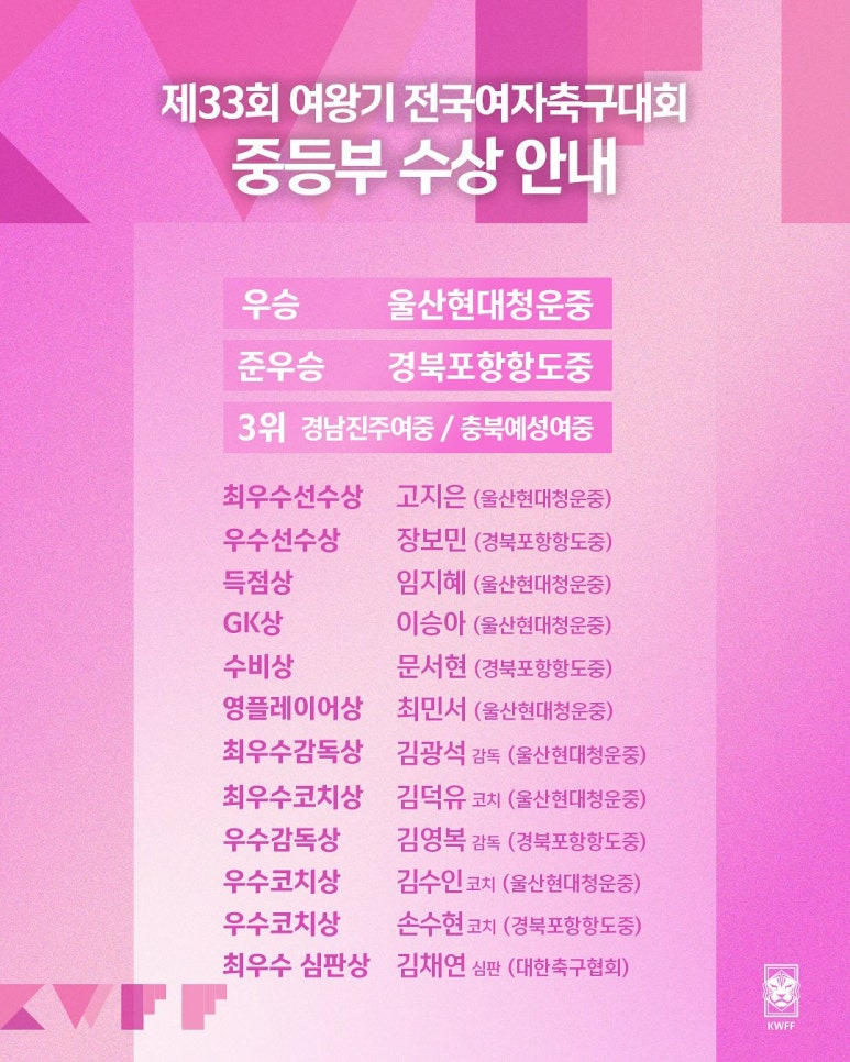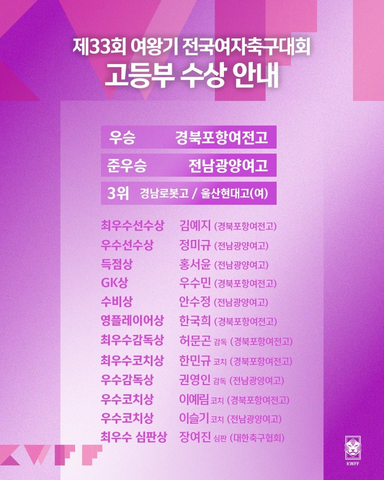 [여왕기] 제33회 여왕기 전국여자축구대회 수상 안내