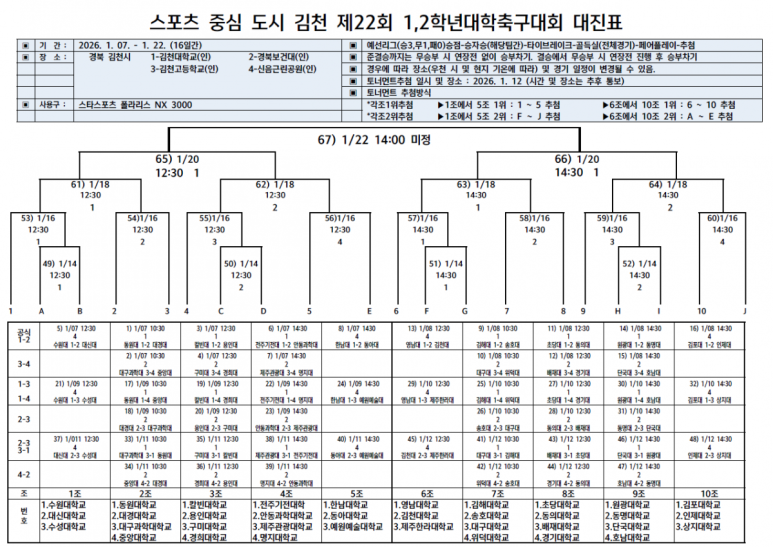 병오년(丙午年) 붉은 말의 해를 맞이하며 한국대학축구연맹이 주최하고 김천시와 김천시축구협회가 주관하는 제22회 1·2학년대학축구대회가 1월 7일 첫 시작을 알렸다.