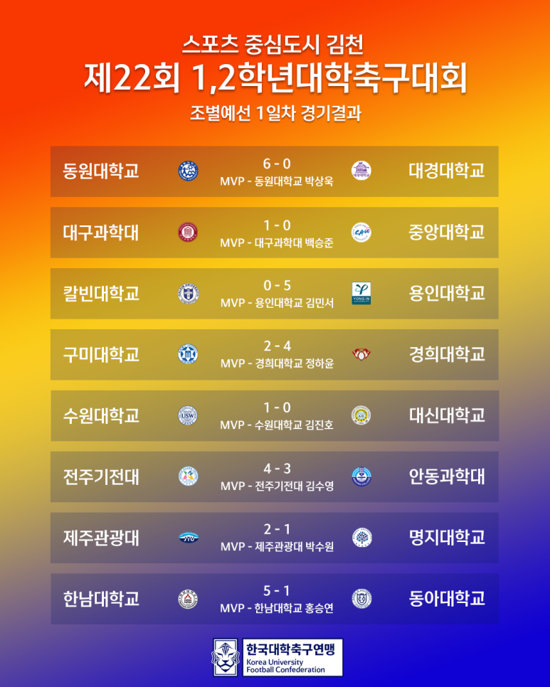 ※ 제22회 1·2학년대학축구대회 조별예선 1일 차 경기결과 1/7 (수)
