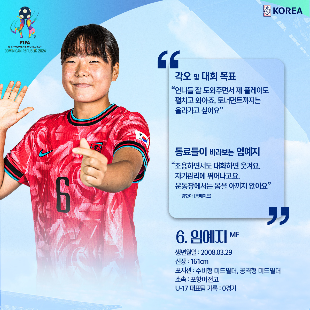 임예지는 여자 U-17 대표팀에서 '적극성'을 담당하고 있다.