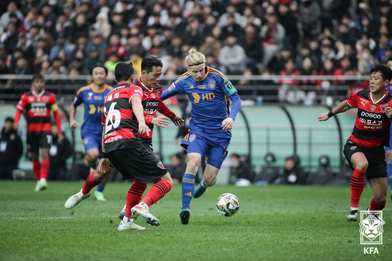 작년 11월 열린 포항스틸러스(빨간색 유니폼)와 울산 HD의 코리아컵 결승전 경기 장면.