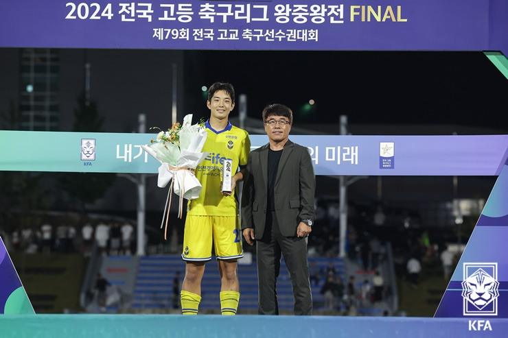 왕중왕전 수비상을 받은 한가온(왼쪽)이 이흥실 KFA 대회위원장과 기념 촬영을 하고 있다