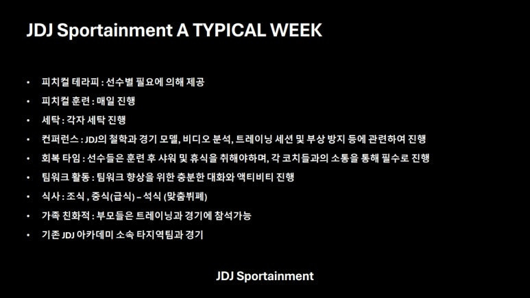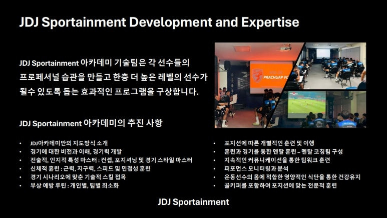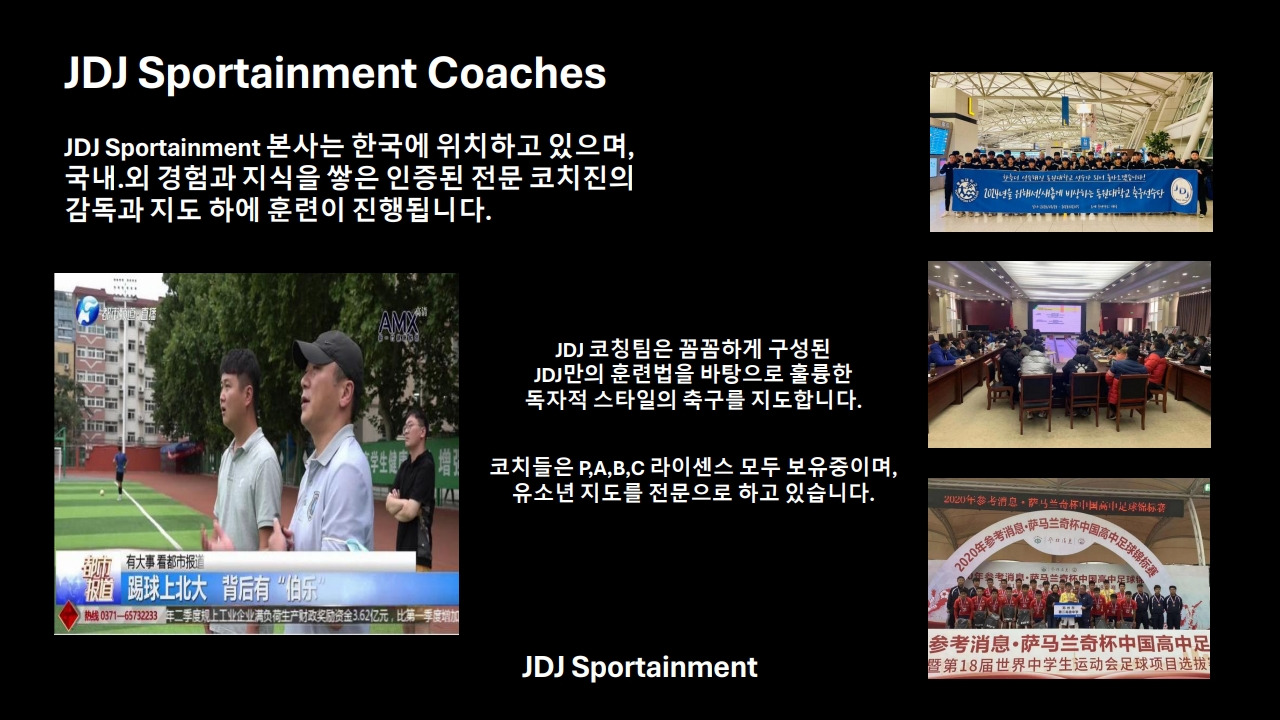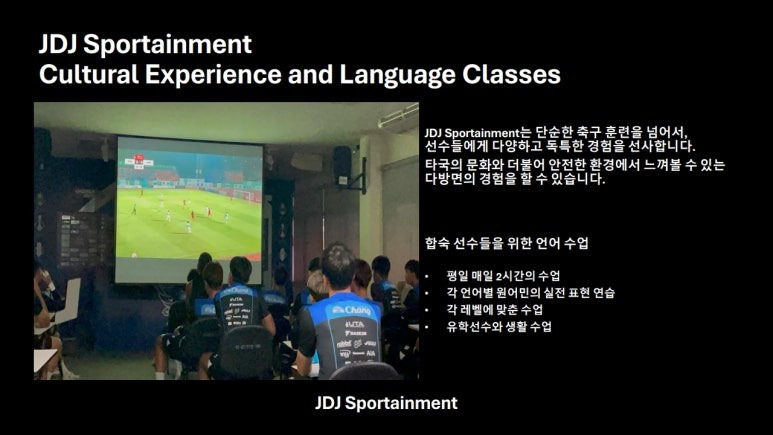 위의 내용은 JDJ FC가 중점적으로 지도할 축구 분야에 대한 내용이며, 그 외에 국제무대 진출에 필요한 필수 언어인 영어 교육을 비롯한 다양한 외국어 교육도 제공한다.