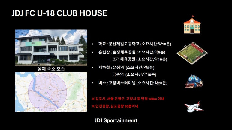 JDJ FC U18 선수들은 문산제일고등학교로 진학하여 학업을 병행하고, 운정 체육공원과 조리 체육공원에서 훈련 일정을 소화하게 된다.