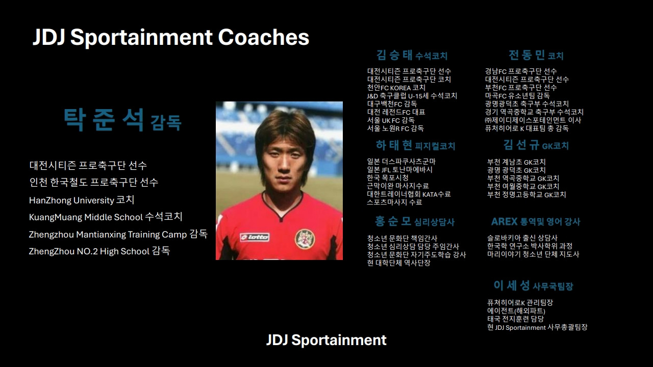 JDJ FC 코칭 스텝은 대전하나시티즌 출신 탁준석 감독을 필두로 대전하나시티즌 출신 김승태 수석코치와 전동민 코치, 김선규 GK 코치, 하태현 피지컬코치, 홍순모 심리상담사와 AREX 통역 및 영어 강사 등으로 구성되었고 이세성 사무국장이 팀의 모든 사무를 담당한다.