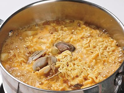 4끓어오르면 라면과 동봉된 수프를 넣어 끓이고,