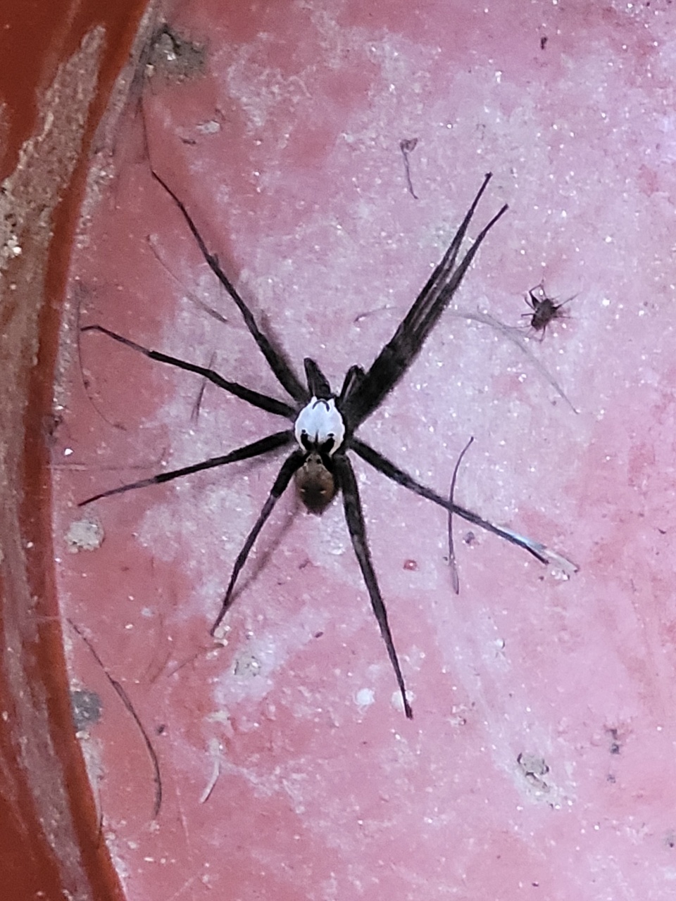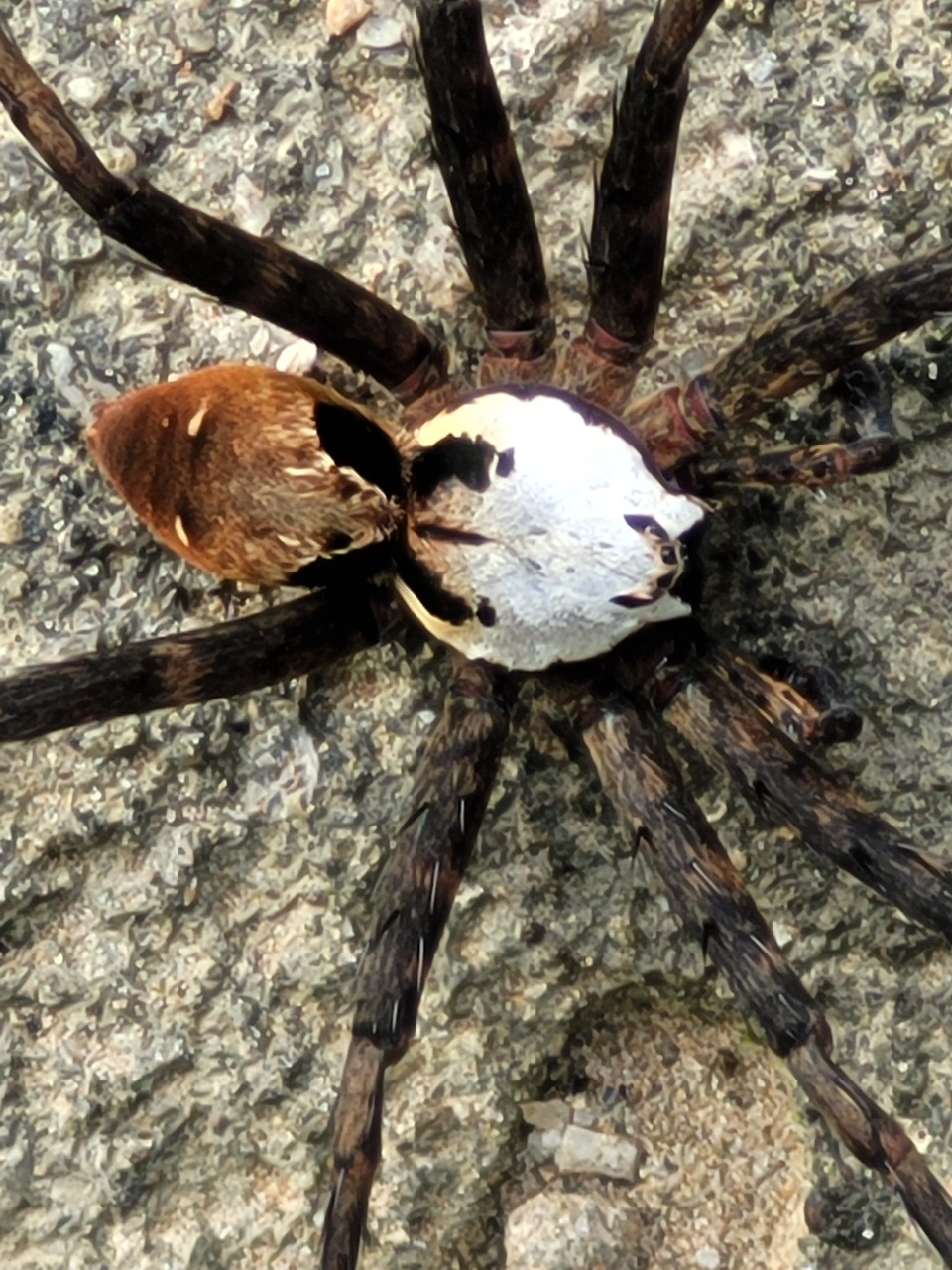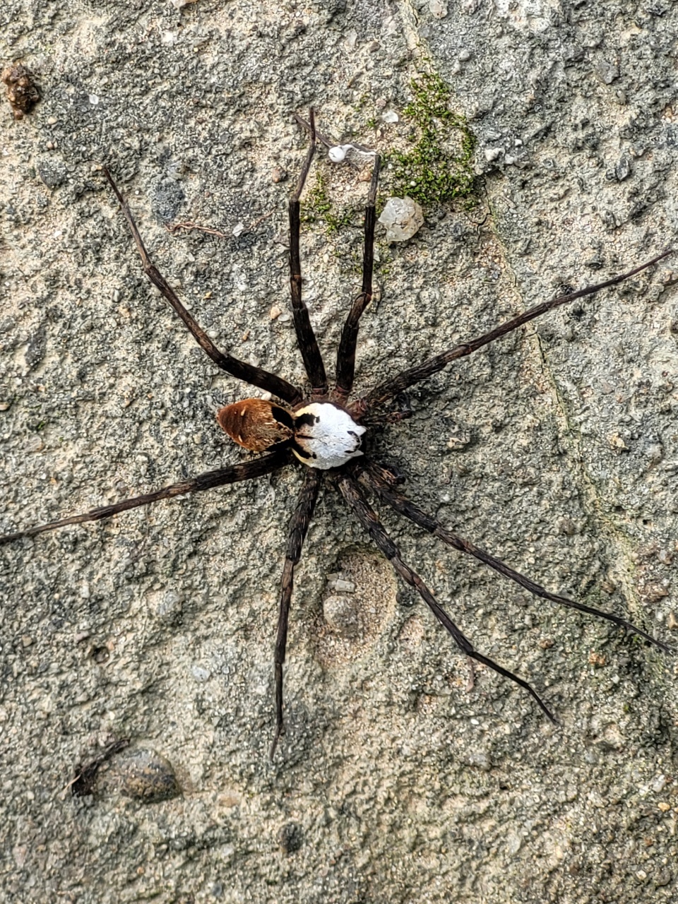 가슴판은 잿빛이 도는 갈색 바탕에 검고 긴 털이 나고 끝이 넷째다리 밑마디 사이로 뻗지 않는다. 다리는 어두운 갈색이다. 넓적다리마디에 누런 갈색 무늬가 있고 넷째다리가 길다. 배는 긴 달걀모양인데, 윗면은 누런 갈색 바탕에 검은 얼룩무늬가 있으나 아랫면에는 무늬가 없다.