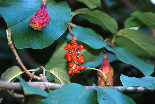 보랏빛의 수술이 아름다우며 은은한 향이 매우 향기롭고 열매는 붉게 익어 벌어지면서 주홍색의 종자가 드러납니다.