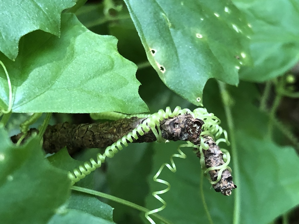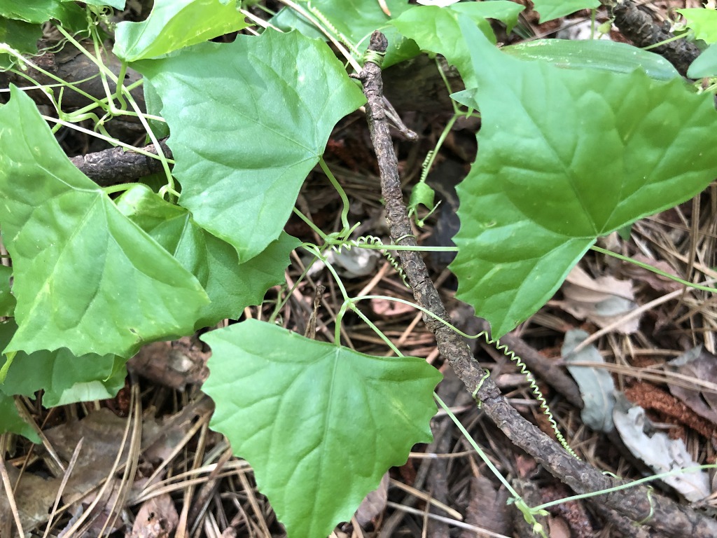 덩굴손이 잎과 마주나기한다. 잎은 어긋나기하며 삼각상 심원형, 편심형 또는 달걀모양이고 끝이 대개 뾰족하지만 둔하게 그치며 밑은 심장저이고 길이 3-6cm, 폭 4-8 cm로서 가장자리에 크고 낮은 톱니가 있으며 3개로 갈라진 듯한 것도 있다.