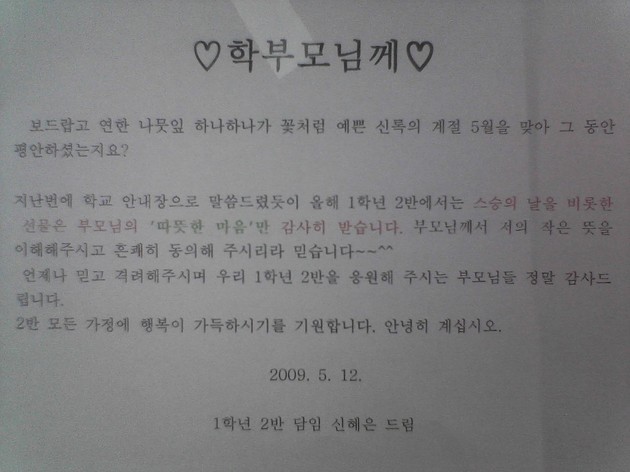 그런데 퇴근 후 집에 들어오니 아내가 활짝 웃으며 반겼다. 분위기 안 좋은데 왠일이지? 어제 아이편으로 알림장 안에 짧은 편지 한통이 있었단다. 아이 담임선생님이 보낸 이 편지에는 '학부모님께'라고 시작해 간단한 인사와 함께 '스승의 날을 비롯한 선물은 부모님의 따뜻한 마음만 감사히 받겠습니다. 부모님께서는 저의 작은 뜻을 이해해주시고 흔쾌히 동의해 주시리라 믿습니다'라는 글귀가 예쁘게 씌여져 있었다.