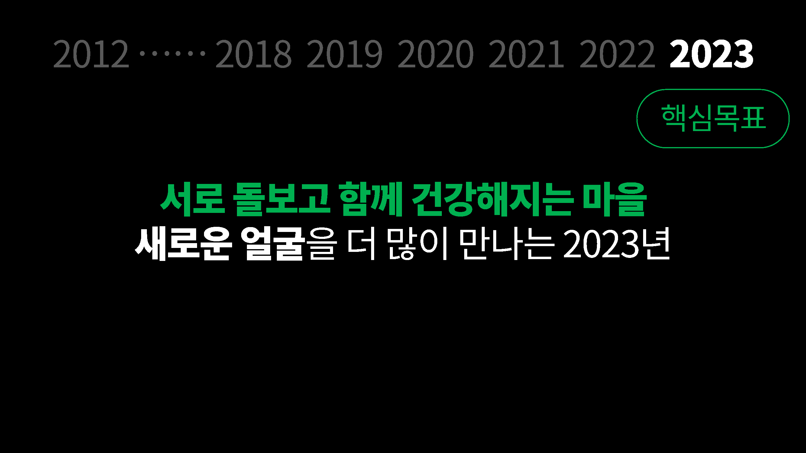 2023년부터는 핵심목표가 조금 변화했습니다. 이전과 달리 핵심목표 첫번째 줄이 "~한 마을"이라고 끝났다고 해요.