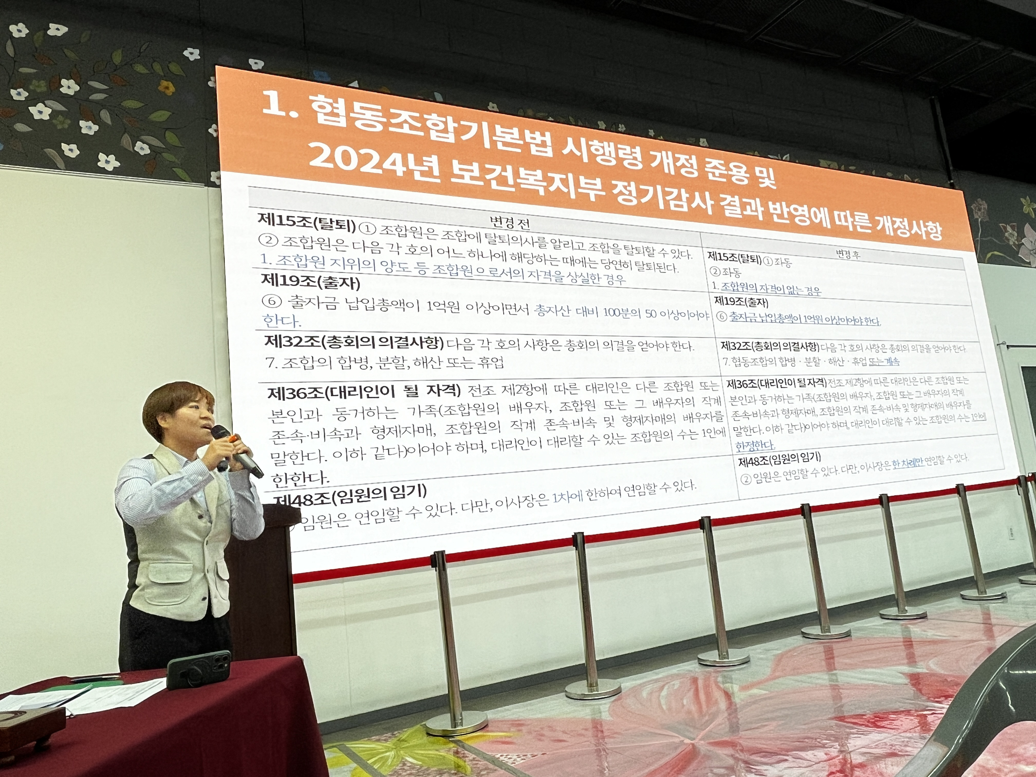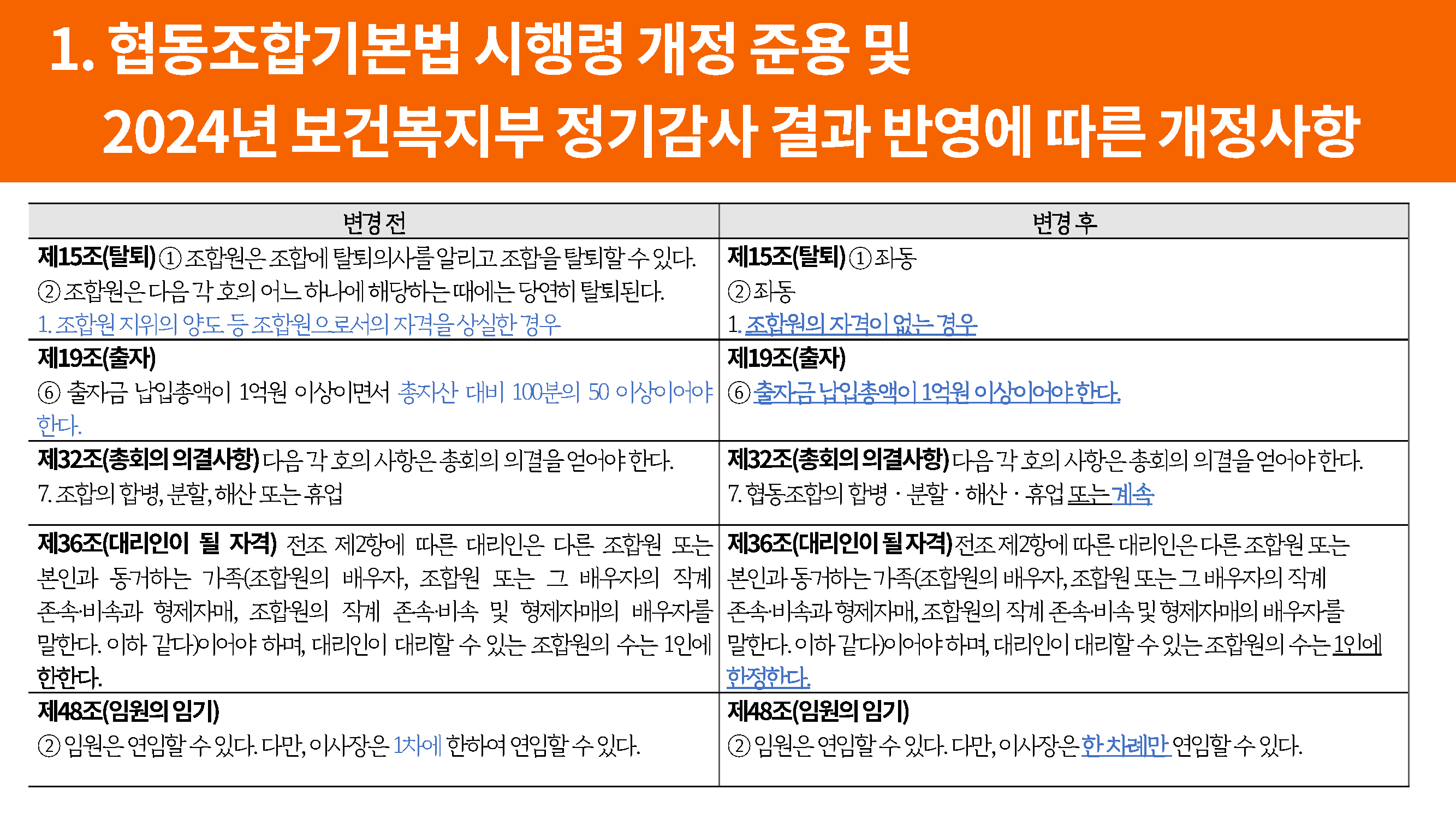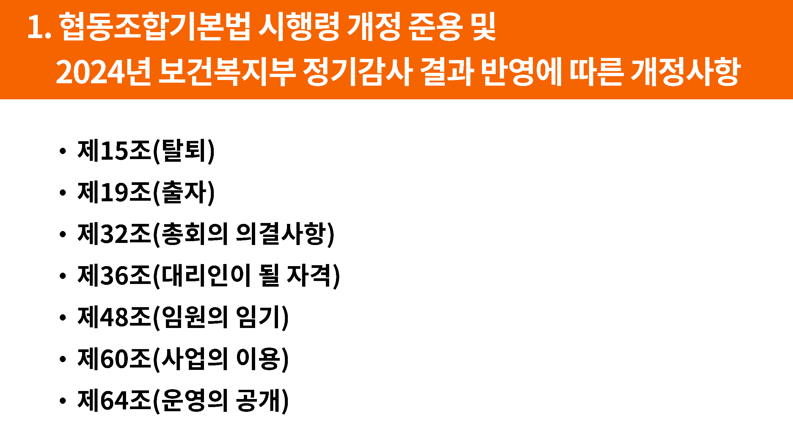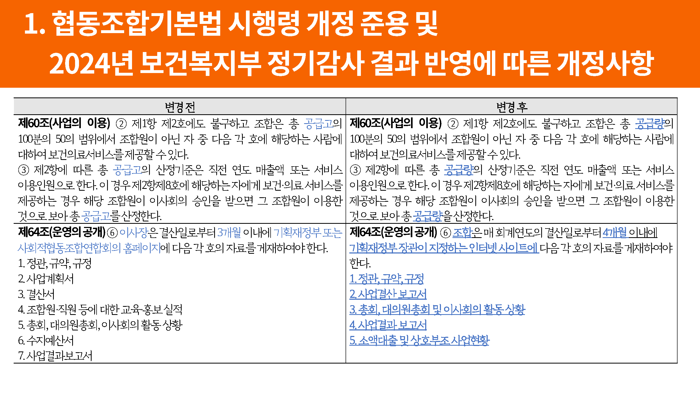 첫번째는 바로 "협동조합기본법 시행령 개정 준용 및 2024년 보건복지부 정기감사 결과 반영"