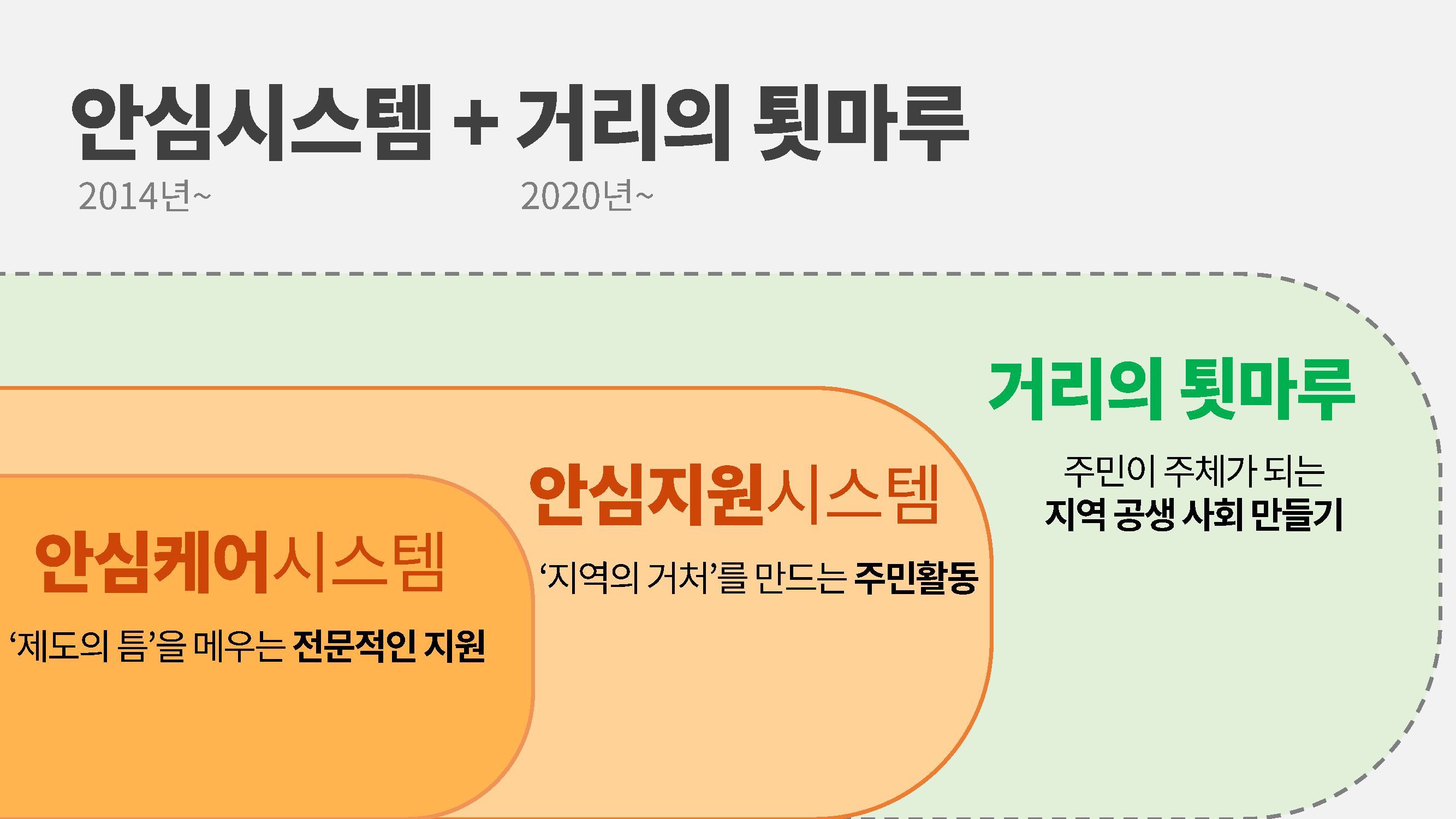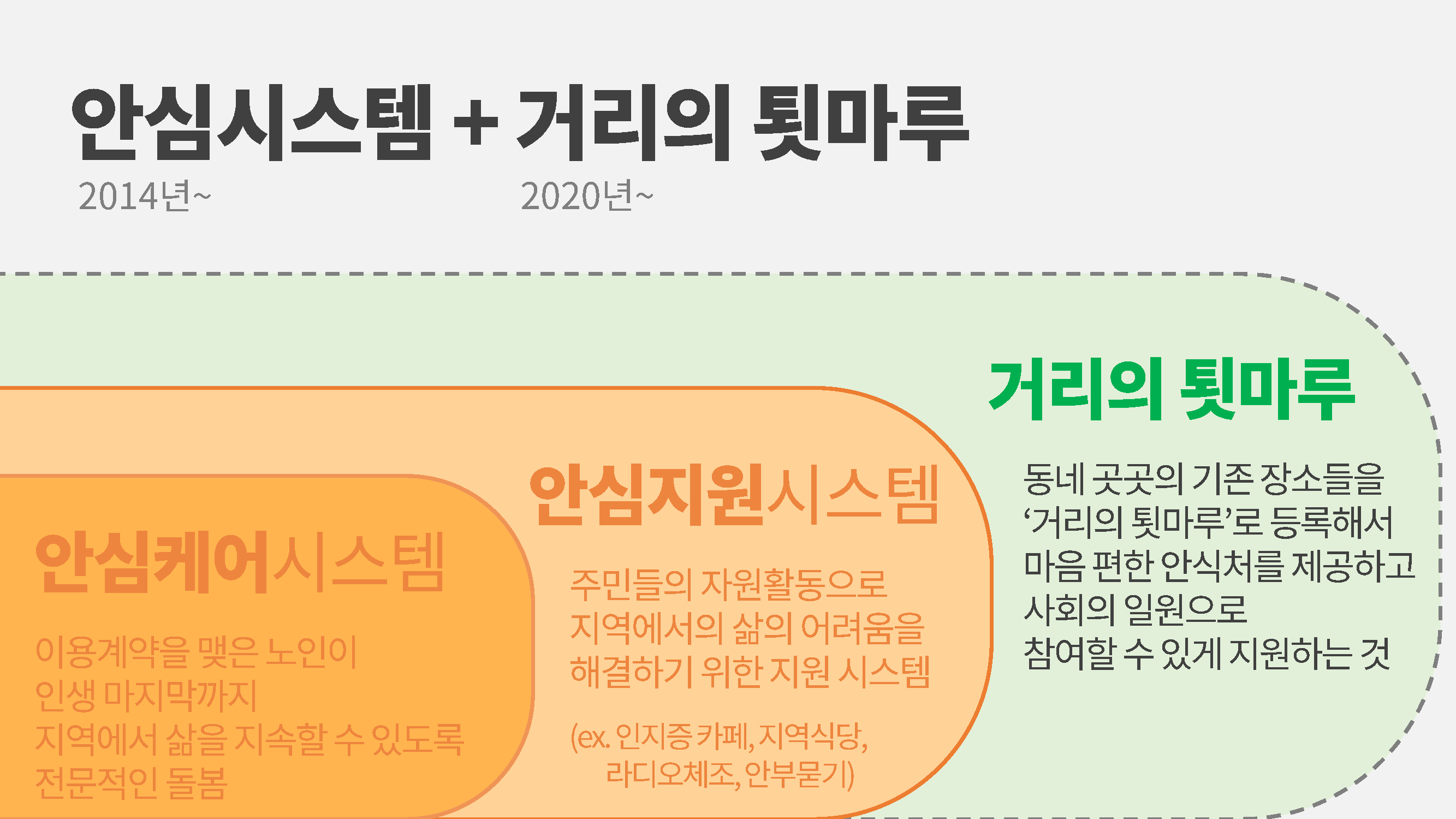 지역의 거처를 만드는 주민활동인 '안심지원 시스템'으로 그 영역이 확장되었습니다. 안심지원 시스템에서는 '인지증 카페, 지역 식당, 라디오 체조, 안부 묻기' 등의 활동을 하는데요.