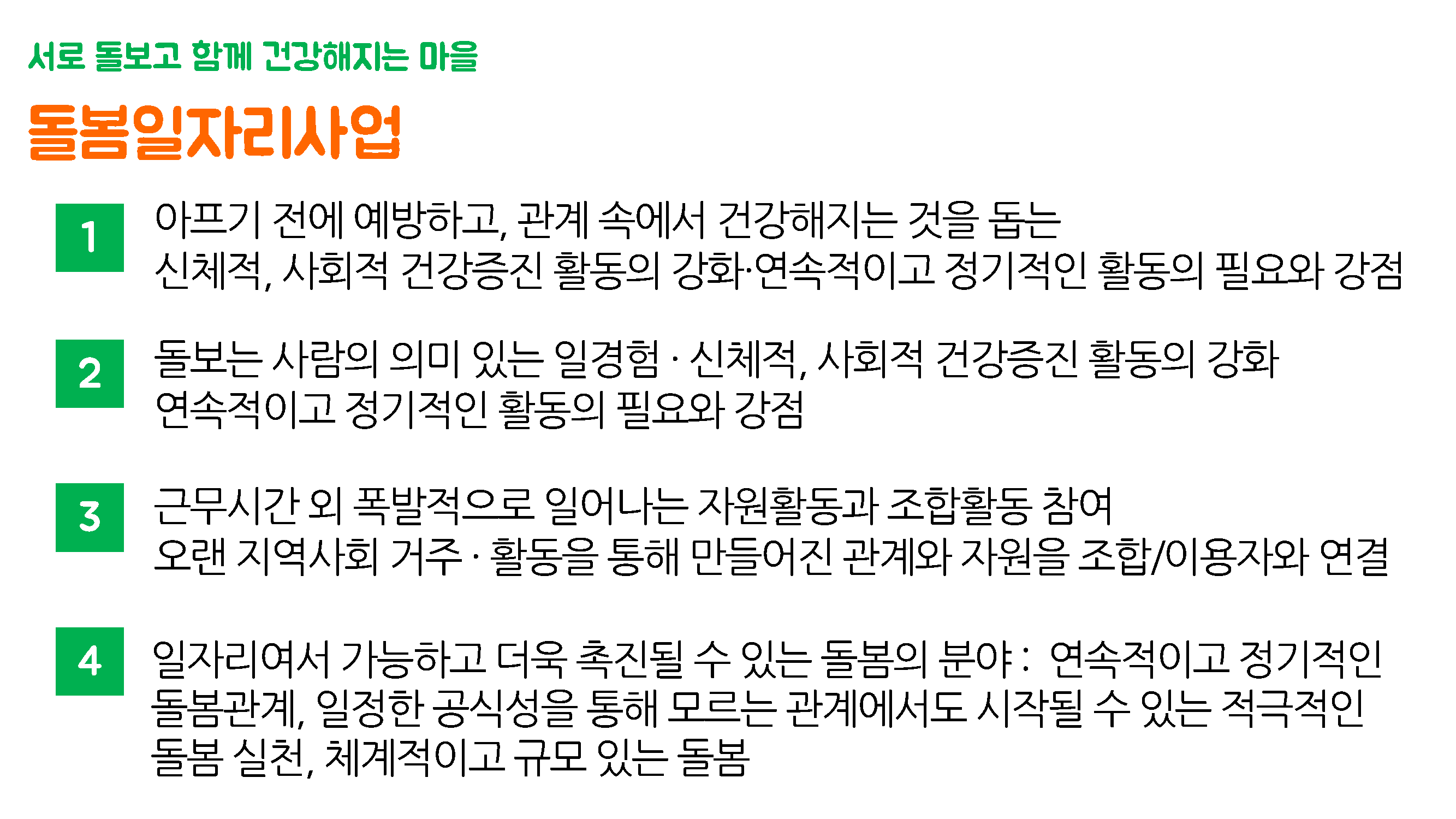 | 살림에서 돌봄일자리 사업을 하고자 하는 이유! 1. 아프기 전에 예방하고, 관계 속에서 건강해지는 것을 돕는 신체적·사회적 건강증진 활동의 강화, 연속적이고 정기적인 활동의 필요와 강점 2. 돌보는 사람의 의미있는 일 경험, 신체적, 사회적 건강증진 활동의 강화, 연속적이고 정기적인 활동의 필요와 강점 3. 근무시간 외 폭발적으로 일어나는 자원활동과 조합활동 참여, 오랜 지역사회 거주 및 활동을 통해 만들어진 관계와 자원을 조합·이용자와 연결 4. 일자리여서 가능하고 더욱 촉진될 수 있는 돌봄의 분야: 연속적이고 정기적인 돌봄관게, 일정한 공식성을 통해 모르는 관계에서도 시작될 수 있는 적극적인 돌봄 실천, 체계적이고 규모있는 돌봄 |