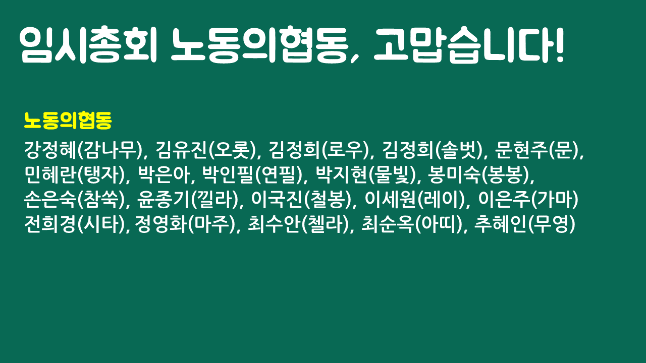 이번 연수공유회 및 임시 대의원 총회는 20명의 노동의협동 참여자분들과 함께 준비하였습니다!