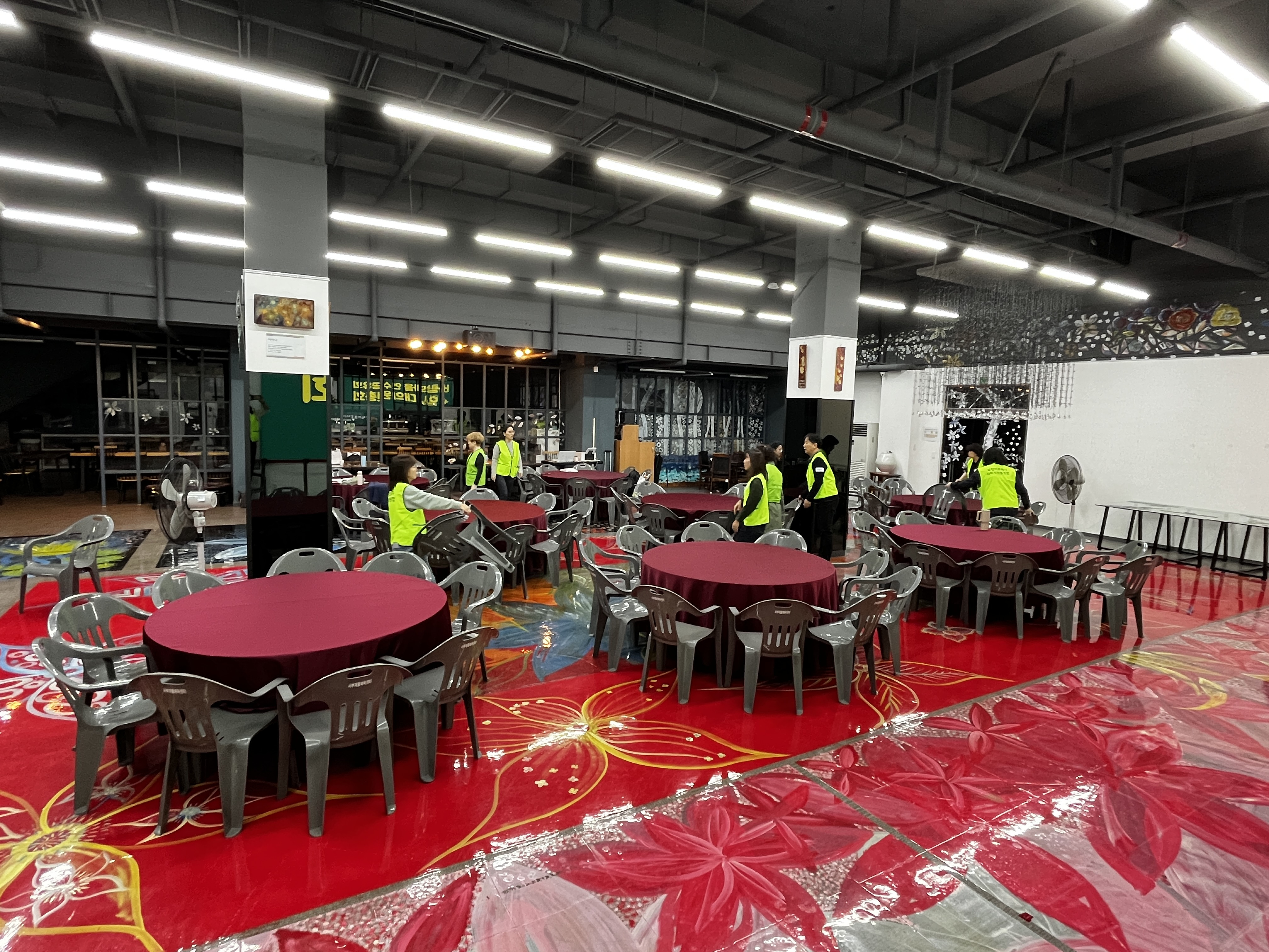 | 행사장 내 의자와 테이블을 정리하고 있는 조합원들. 노동의협동 참여를 의미하는 형광색 조끼를 입고 있다. | 대의원, 조합원 및 지역주민 나눈 접수대에서 대기하고 있는 노동의협동 참여 조합원들. |