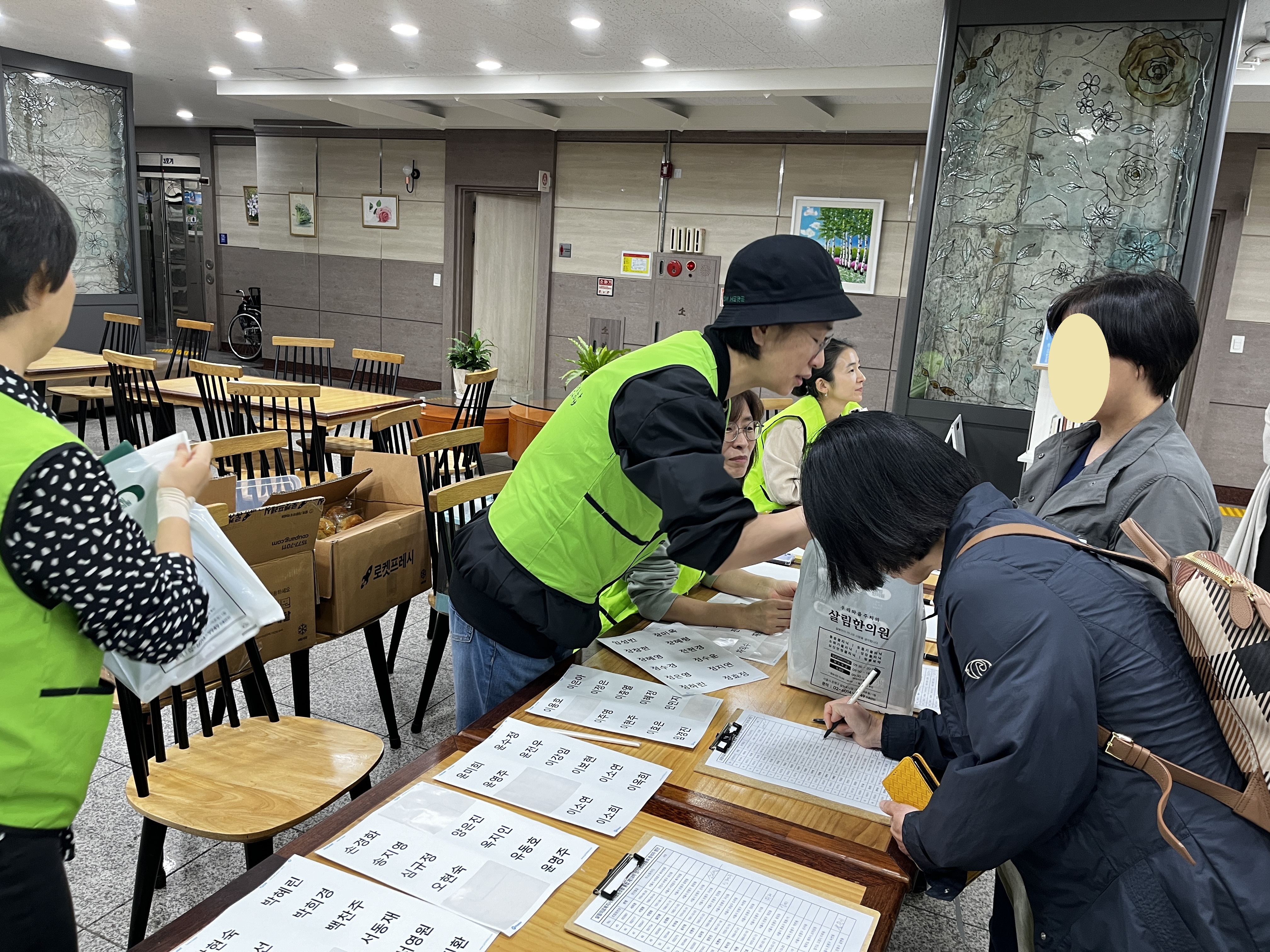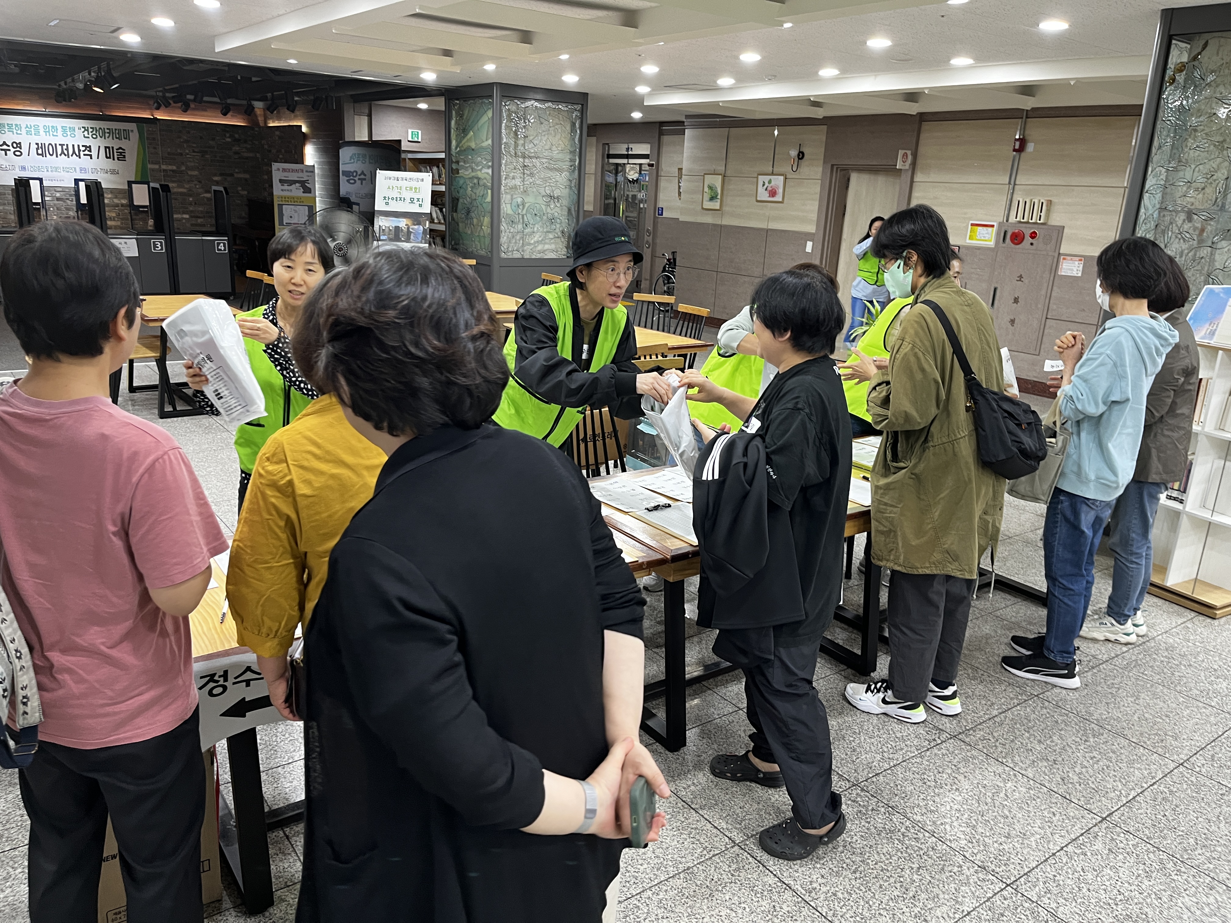 | 접수대에서 참여 확인 및 이름표, 기념품을 받아가고 있는 조합원 및 대의원 | |